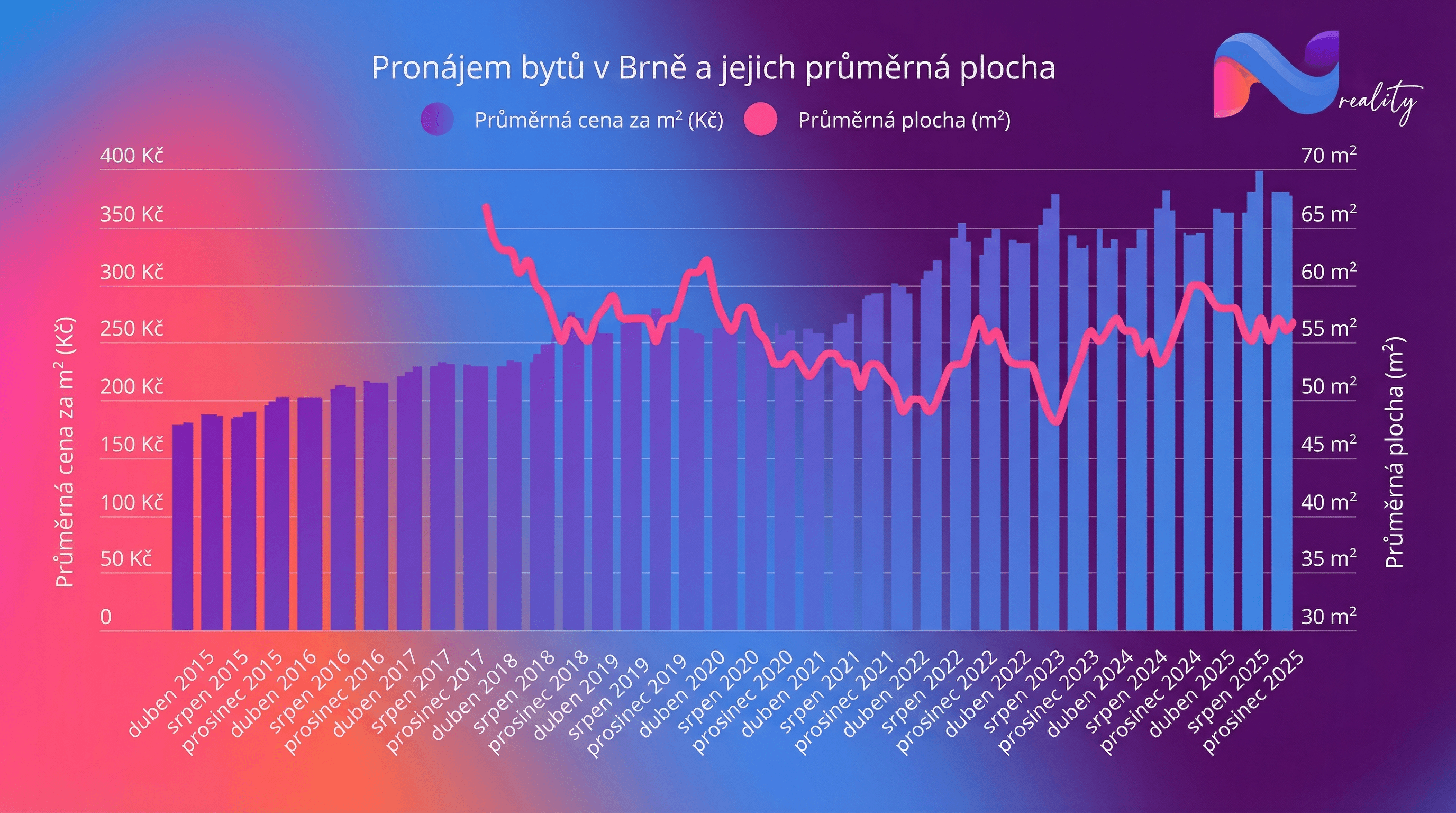 Při pohledu na dlouhodobý vývoj (viz data z let 2015–2026) vidíme fascinující trend. Zatímco v roce 2015 se průměrná cena nájmu v Brně pohybovala kolem 170 Kč/m², dnes, na začátku roku 2026, atakujeme hranici 370–380 Kč/m².