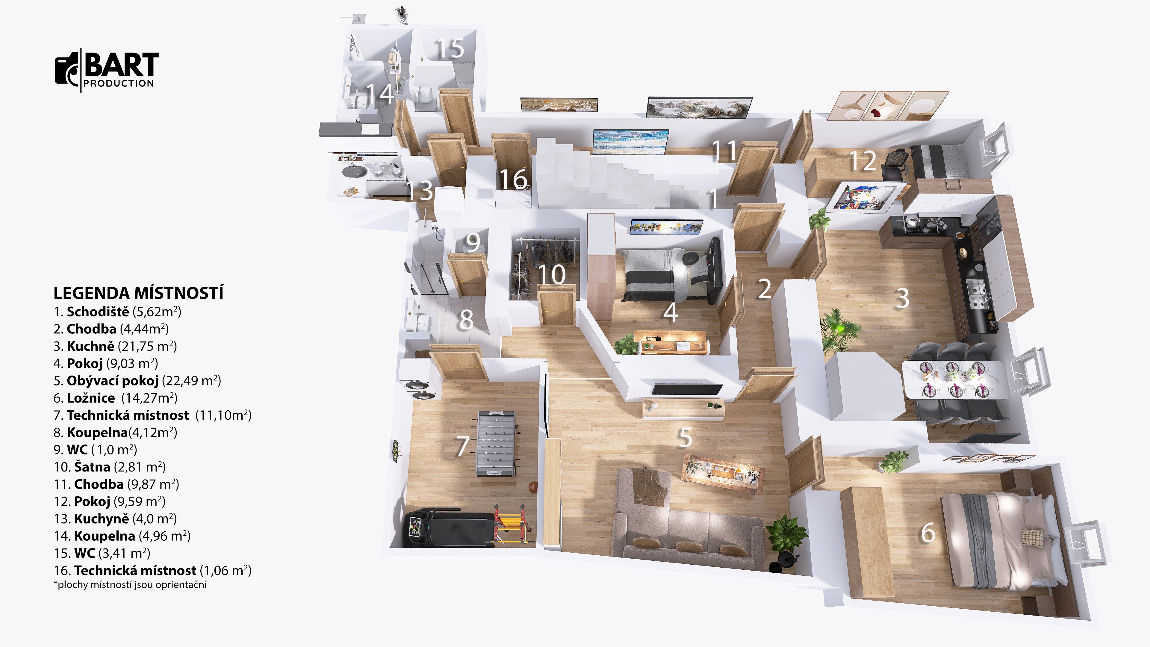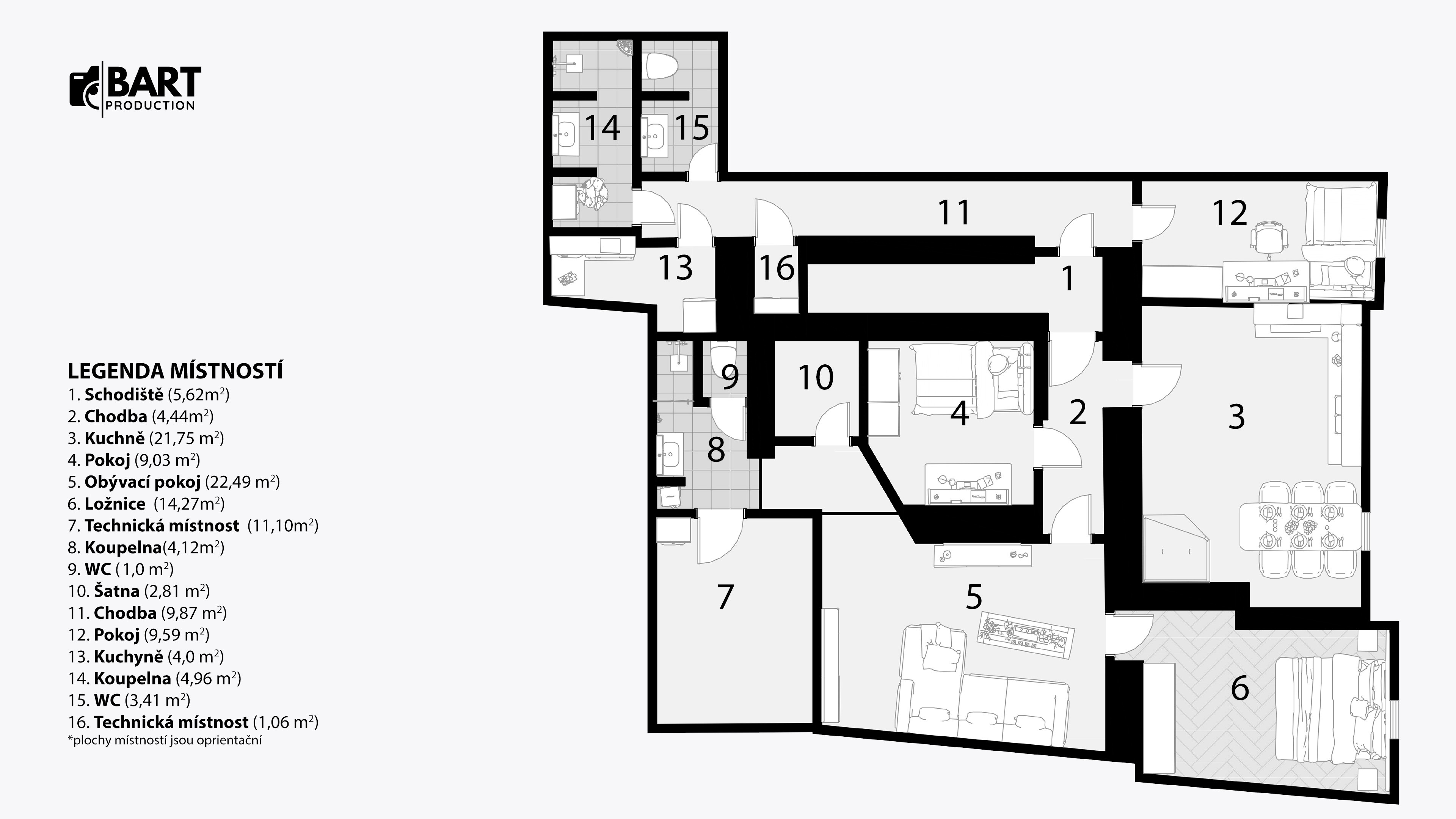 Dispozice: Prostor je členěn na apartmány/části, kde každý je vybaven vlastní kuchyní, WC a koupelnou.