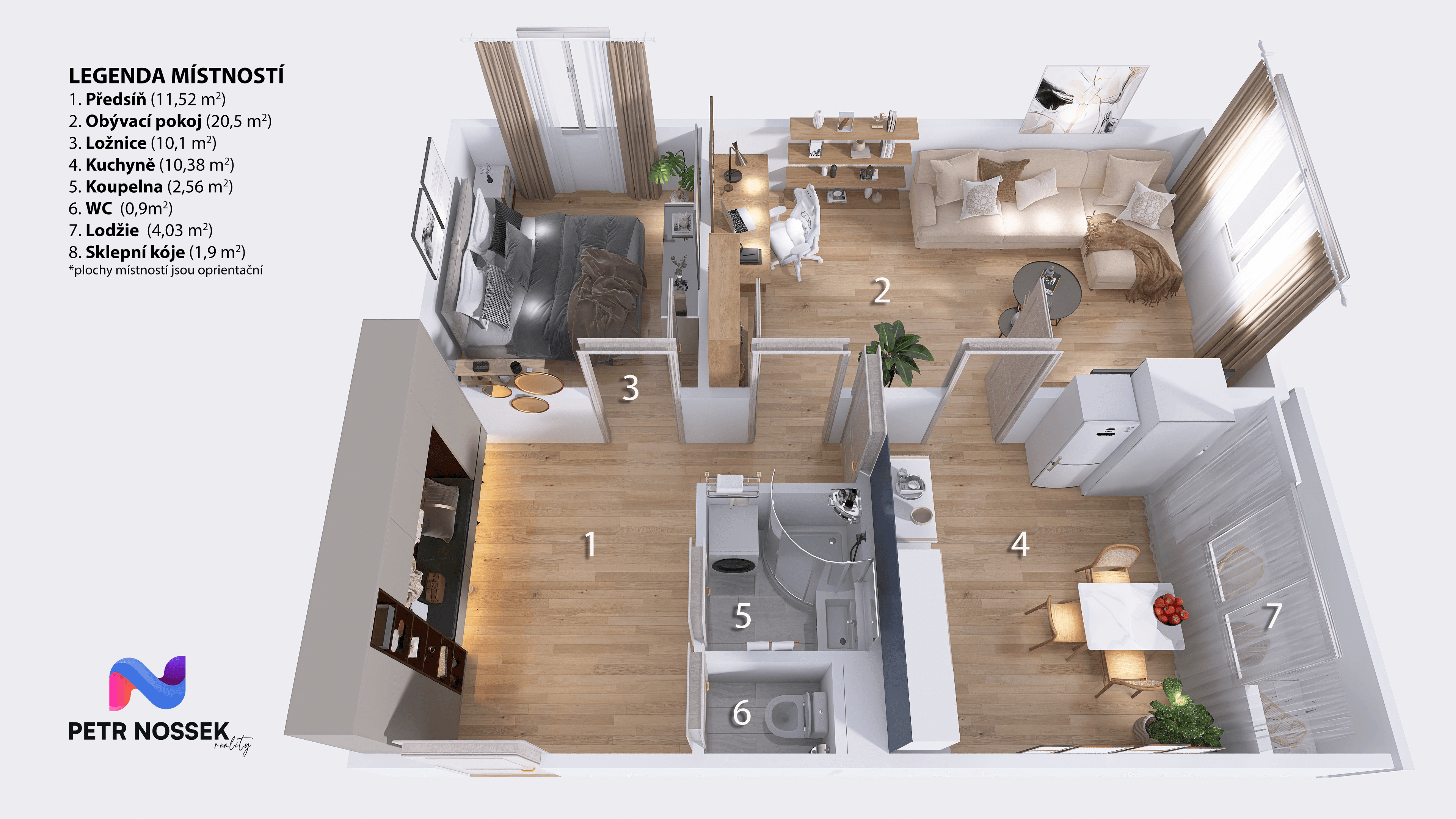 Úložné prostory: K bytu náleží sklepní kóje (1,9 m²) a přímo v bytě je k dispozici spíž (0,4 m²).