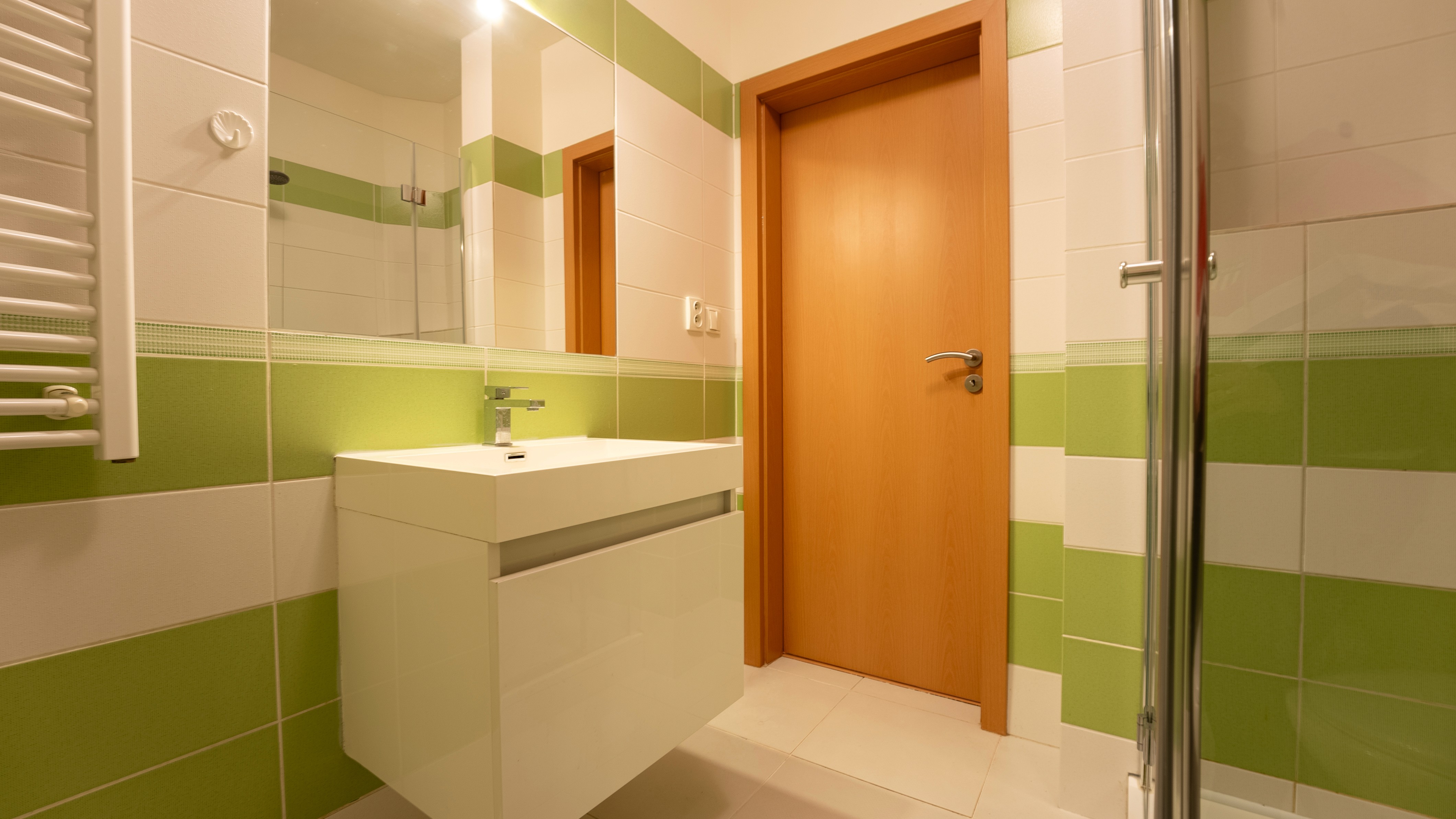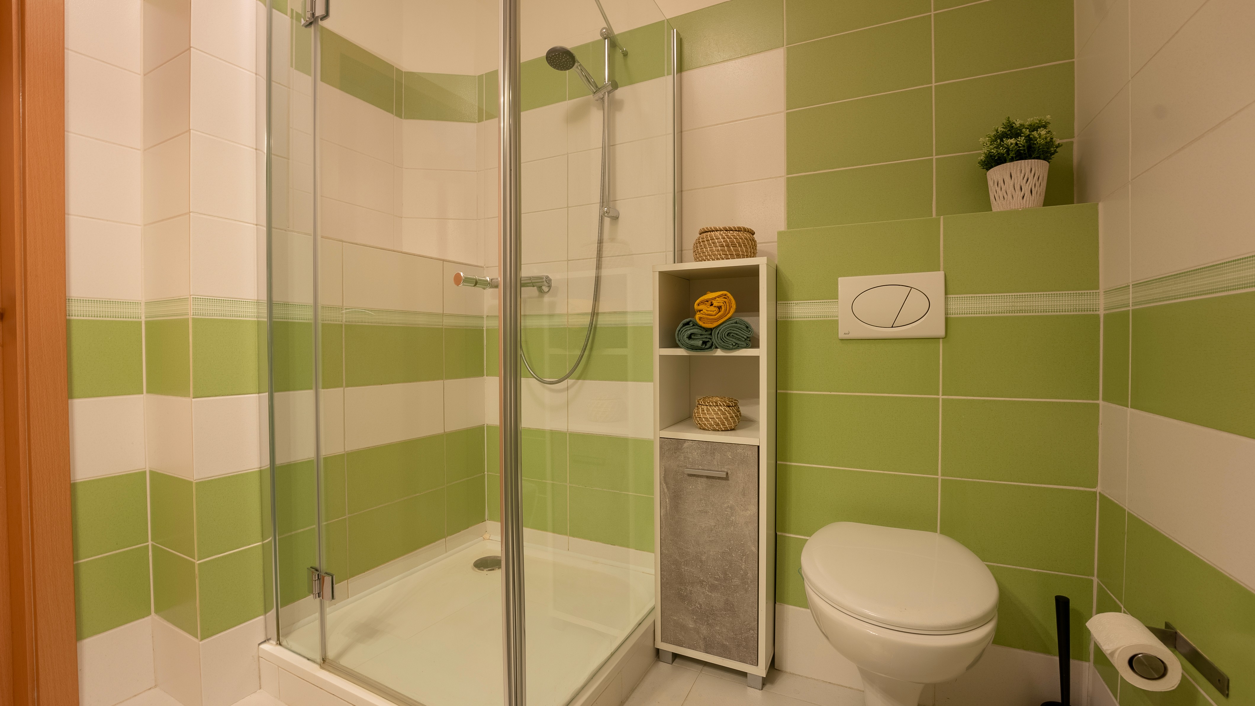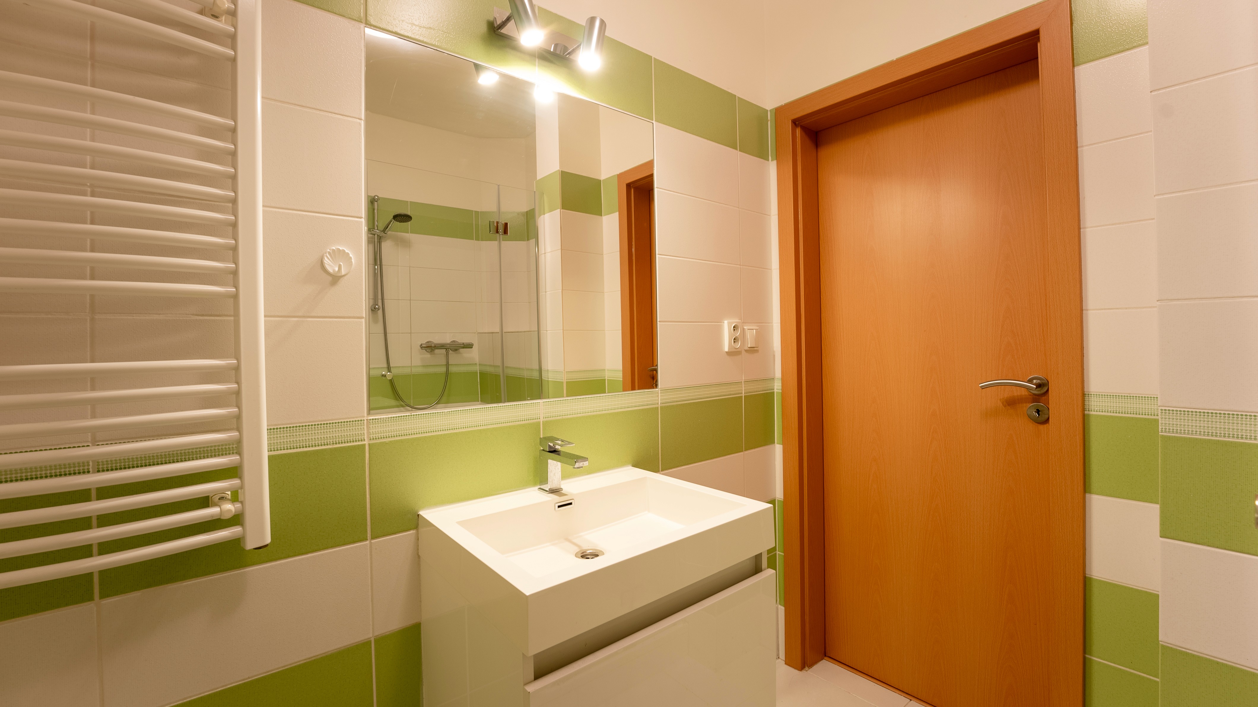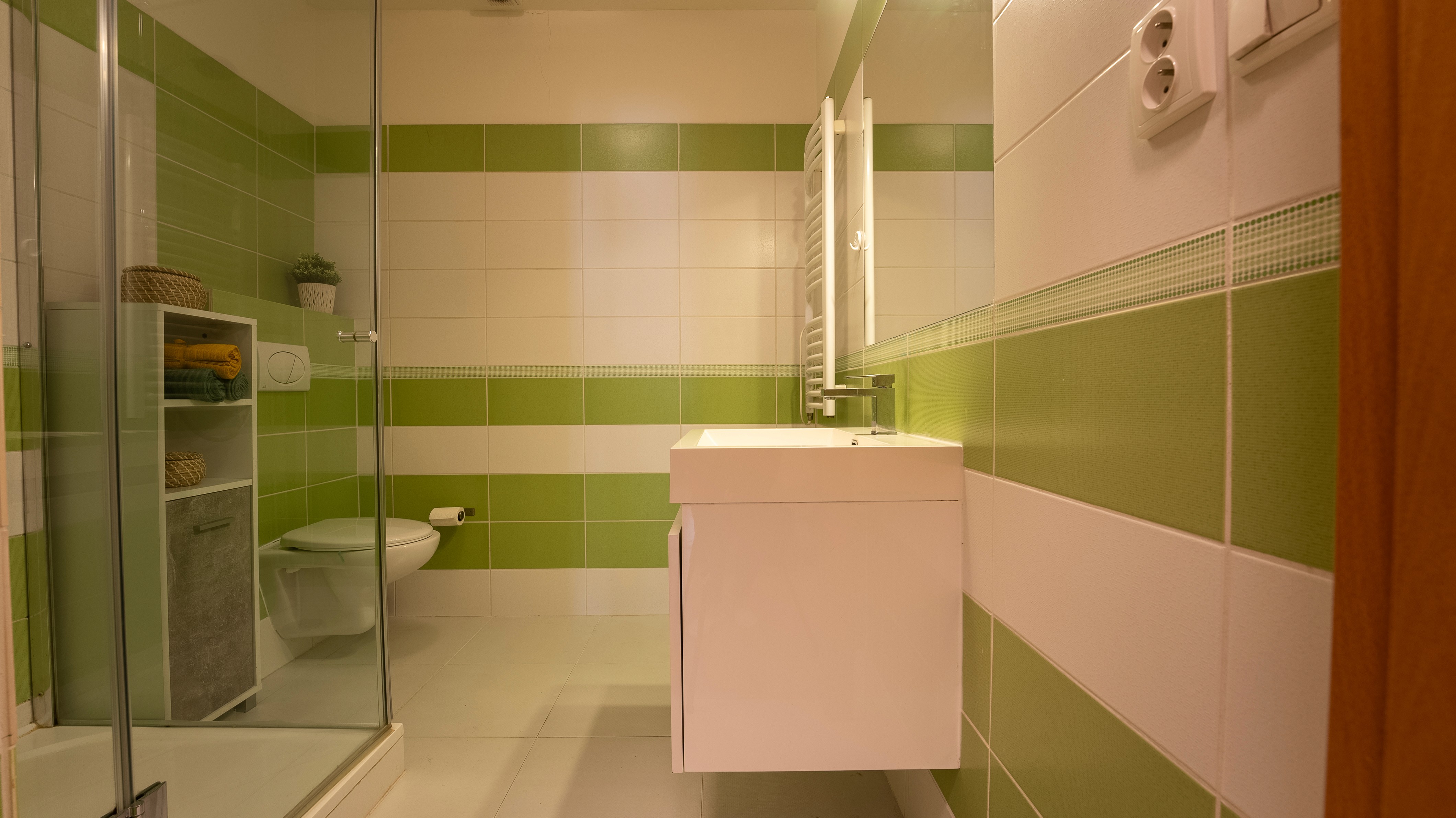 Koupelna + WC (4,1 m²): Společná, vybavená sprchovým koutem, umyvadlem, toaletou a topným žebříkem.