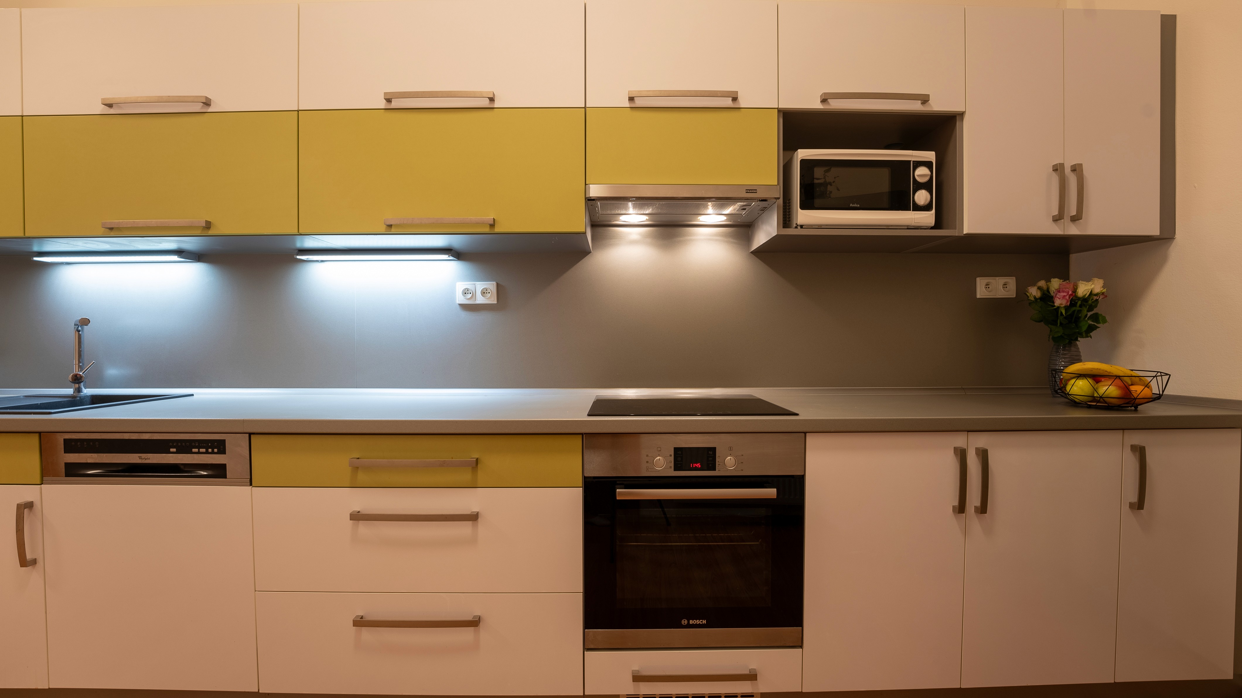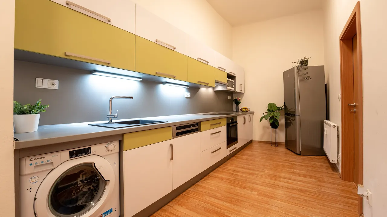 Kuchyně (17,6 m²): Moderní kuchyňská linka na míru od firmy GABON o délce 4,5 m. Vybavena spotřebiči: sklokeramická varná deska, elektrická trouba, myčka, lednice s mrazákem a vestavná pračka.