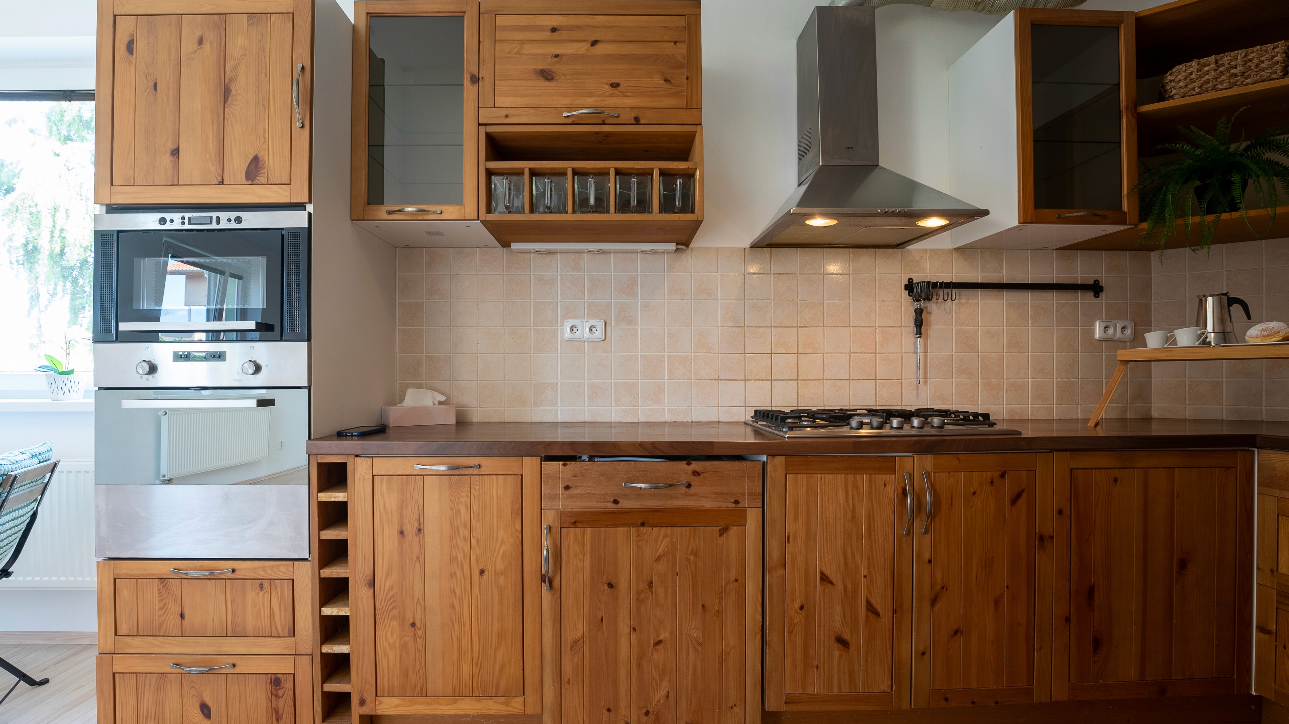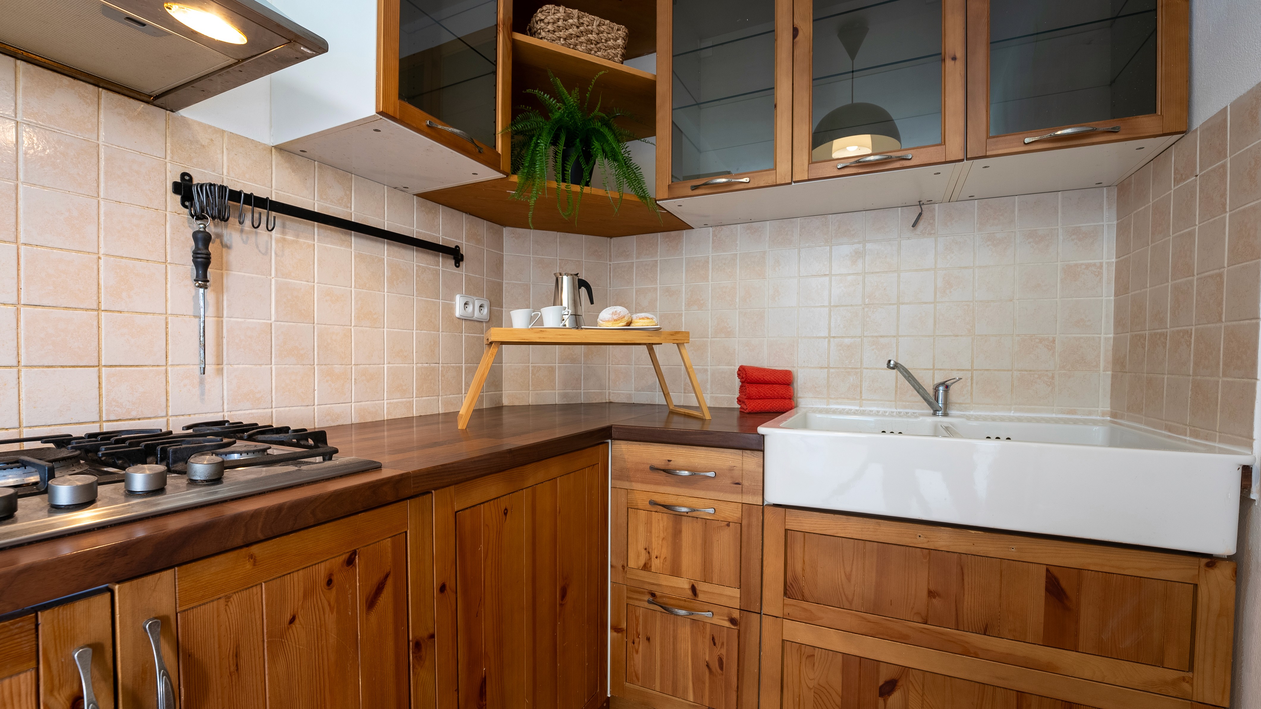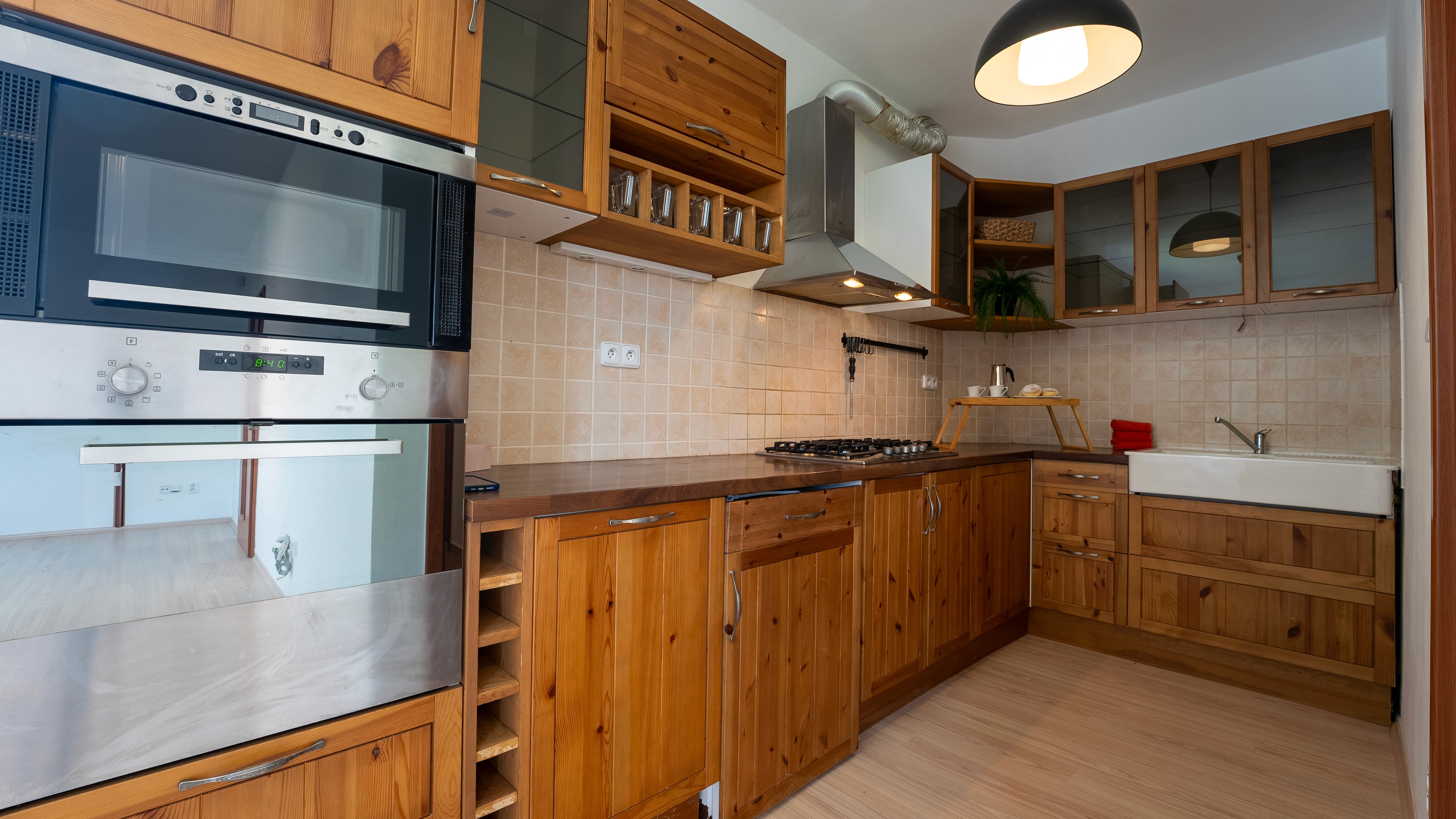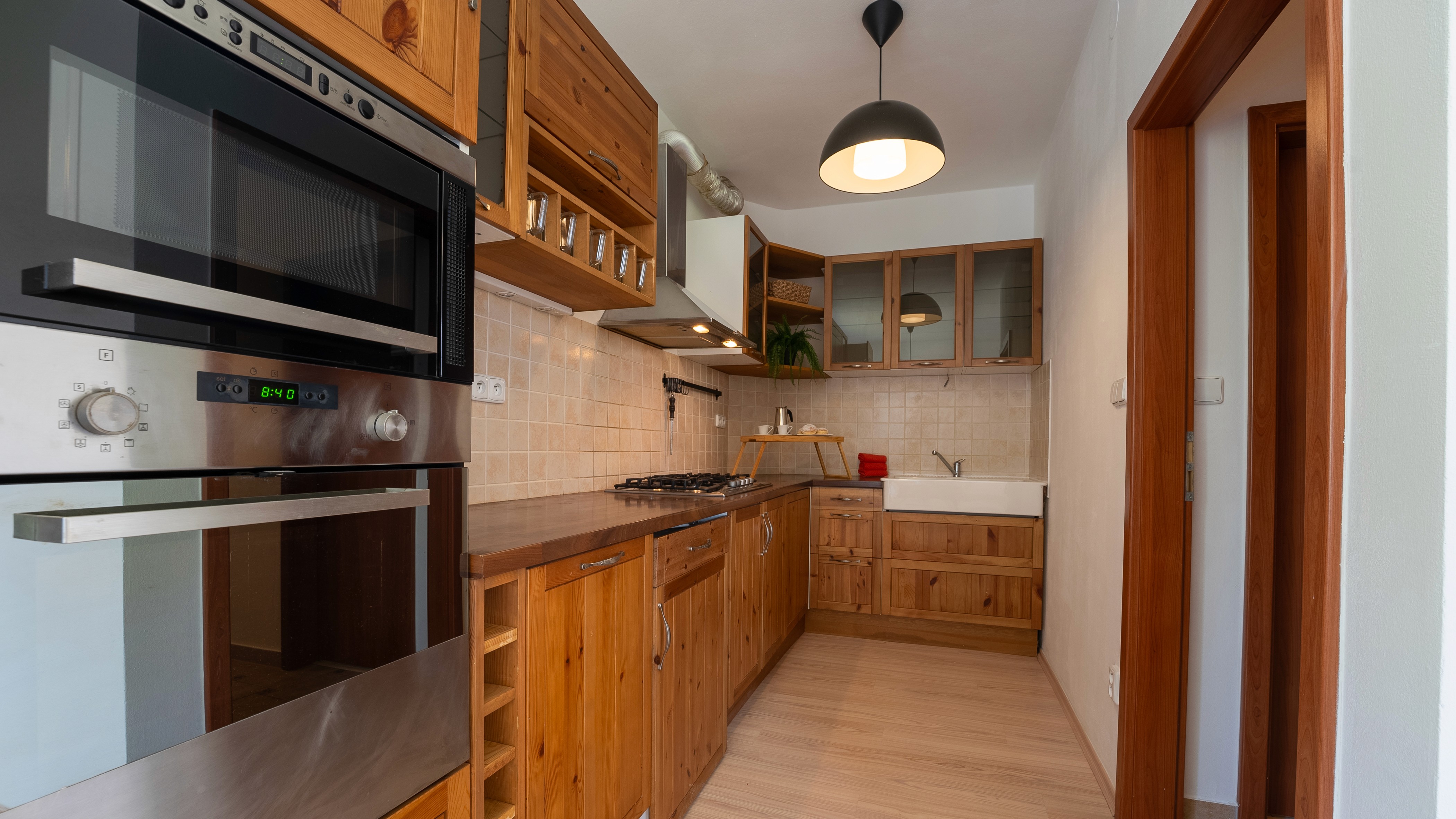 Obývací pokoj s kuchyňským koutem (30,19 m²): Kuchyň je vybavena vestavnou troubou, mikrovlnkou, plynovým sporákem a lednicí.
