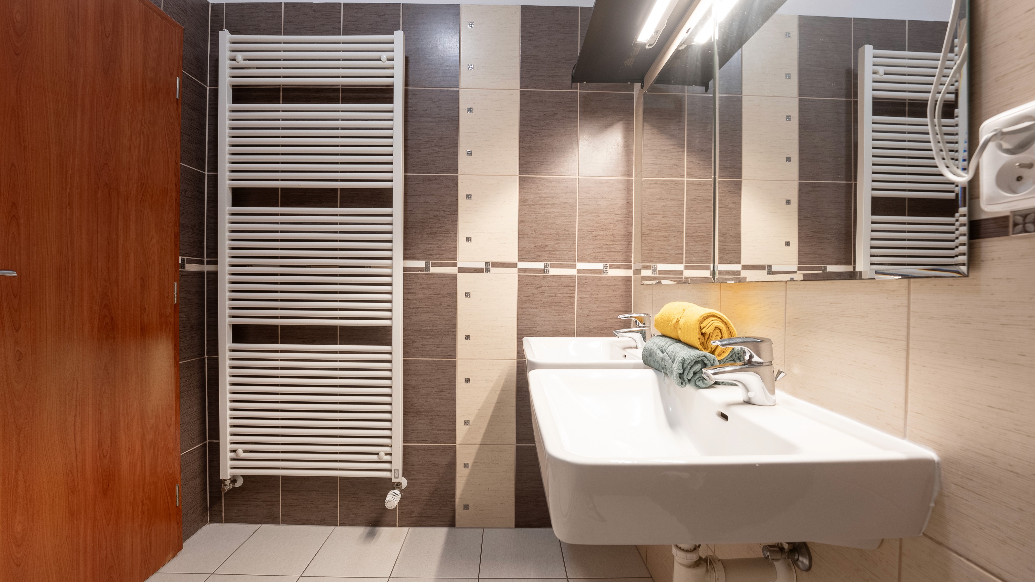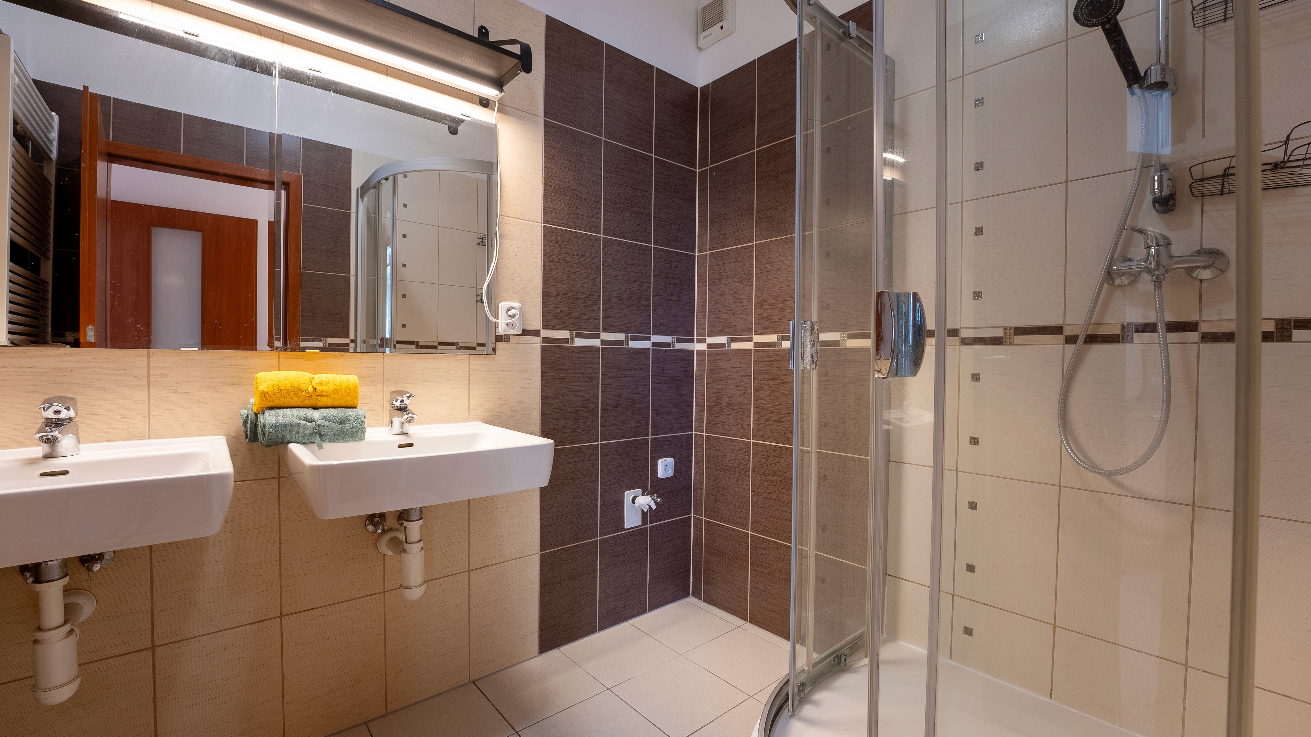 Koupelna (4,26 m²): Vybavena dvěma umyvadly, sprchovým koutem a místem pro pračku i sušičku.