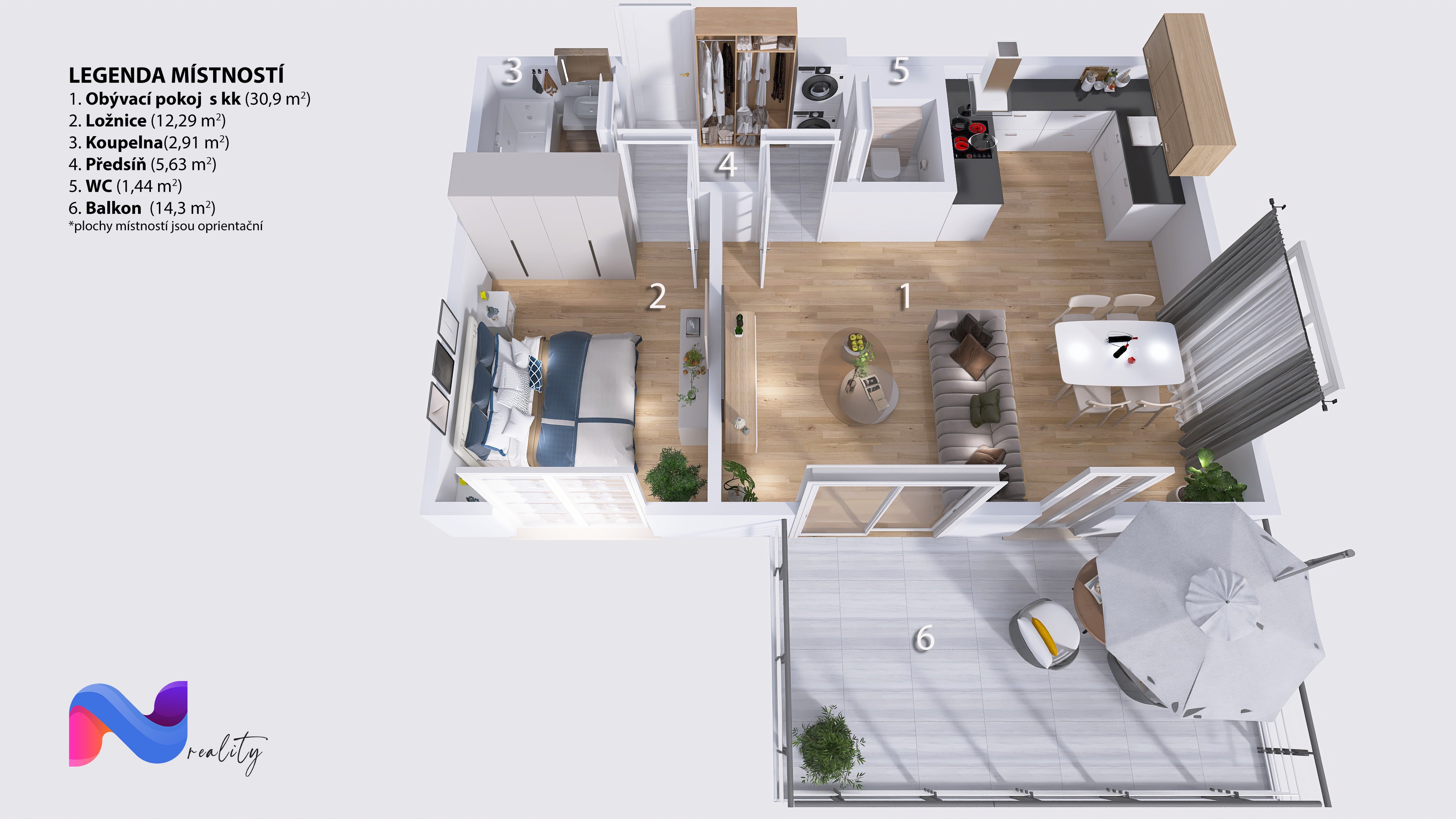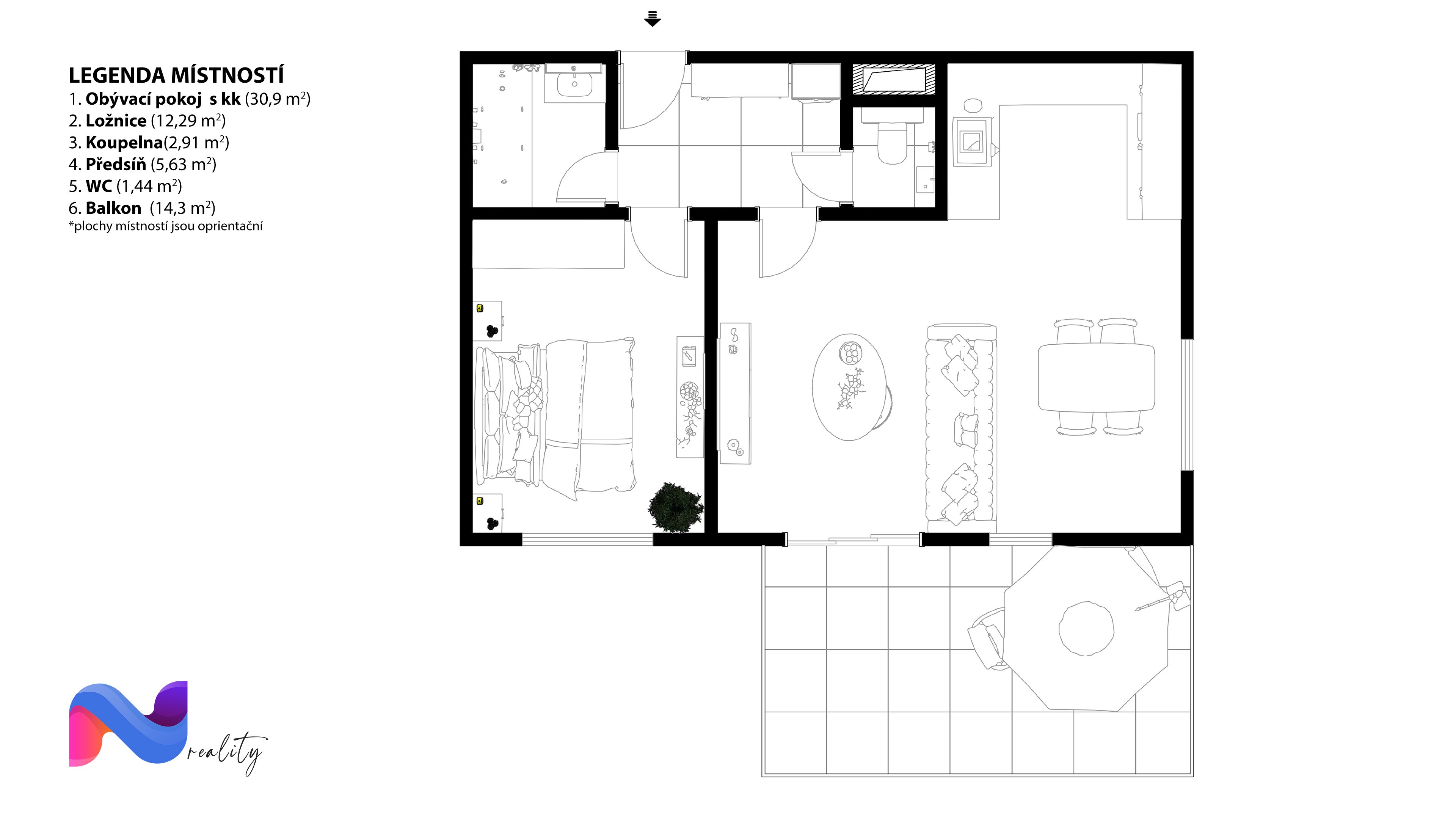 Balkon (14,30 m²): Ideální pro relaxaci s výhledem do zeleně.