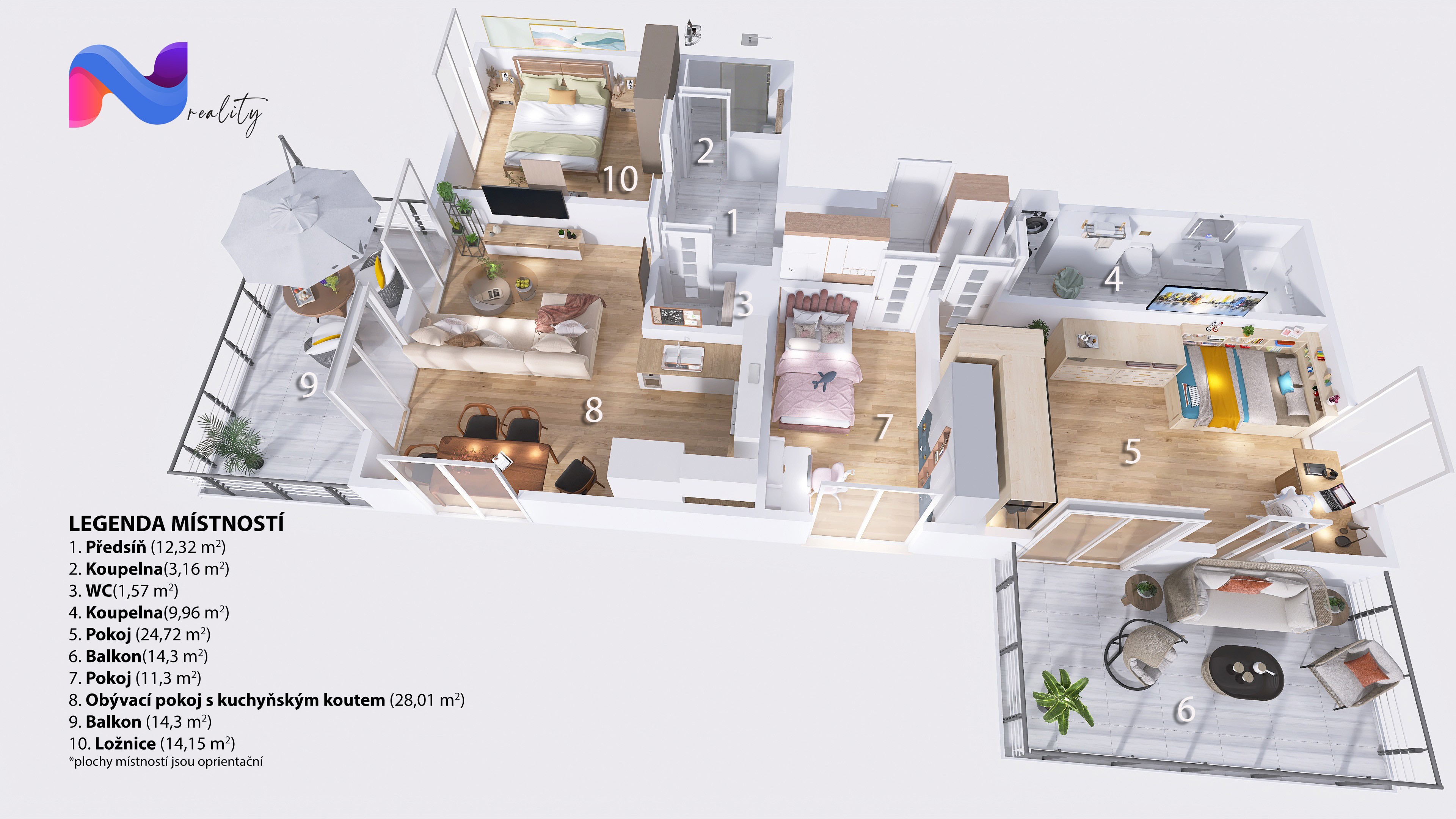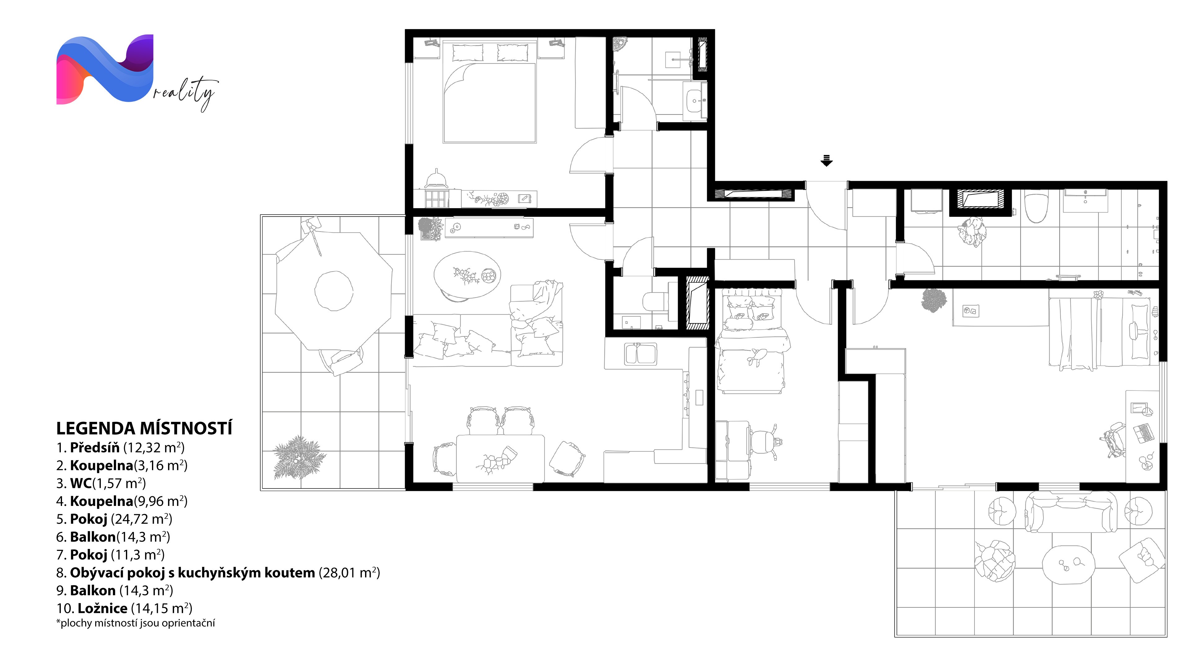Dva balkony (2x 14 m²): Luxusní venkovní prostor o celkové ploše téměř 29 m². Jeden balkon je orientován na jih (přístupný z obýváku a ložnice), druhý na západ (přístupný ze dvou pokojů). Slunce si užijete po celý den.