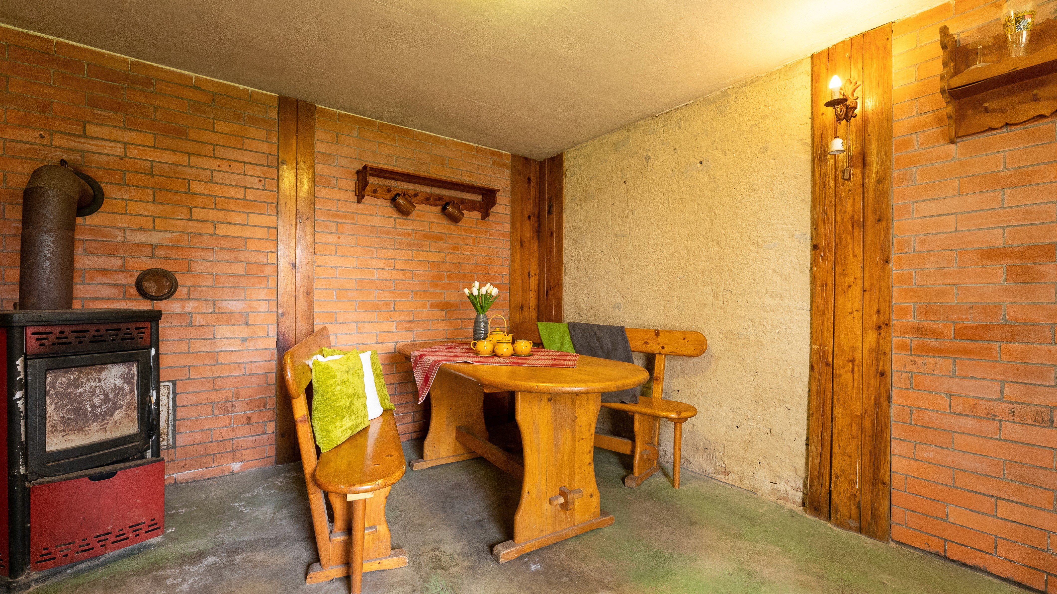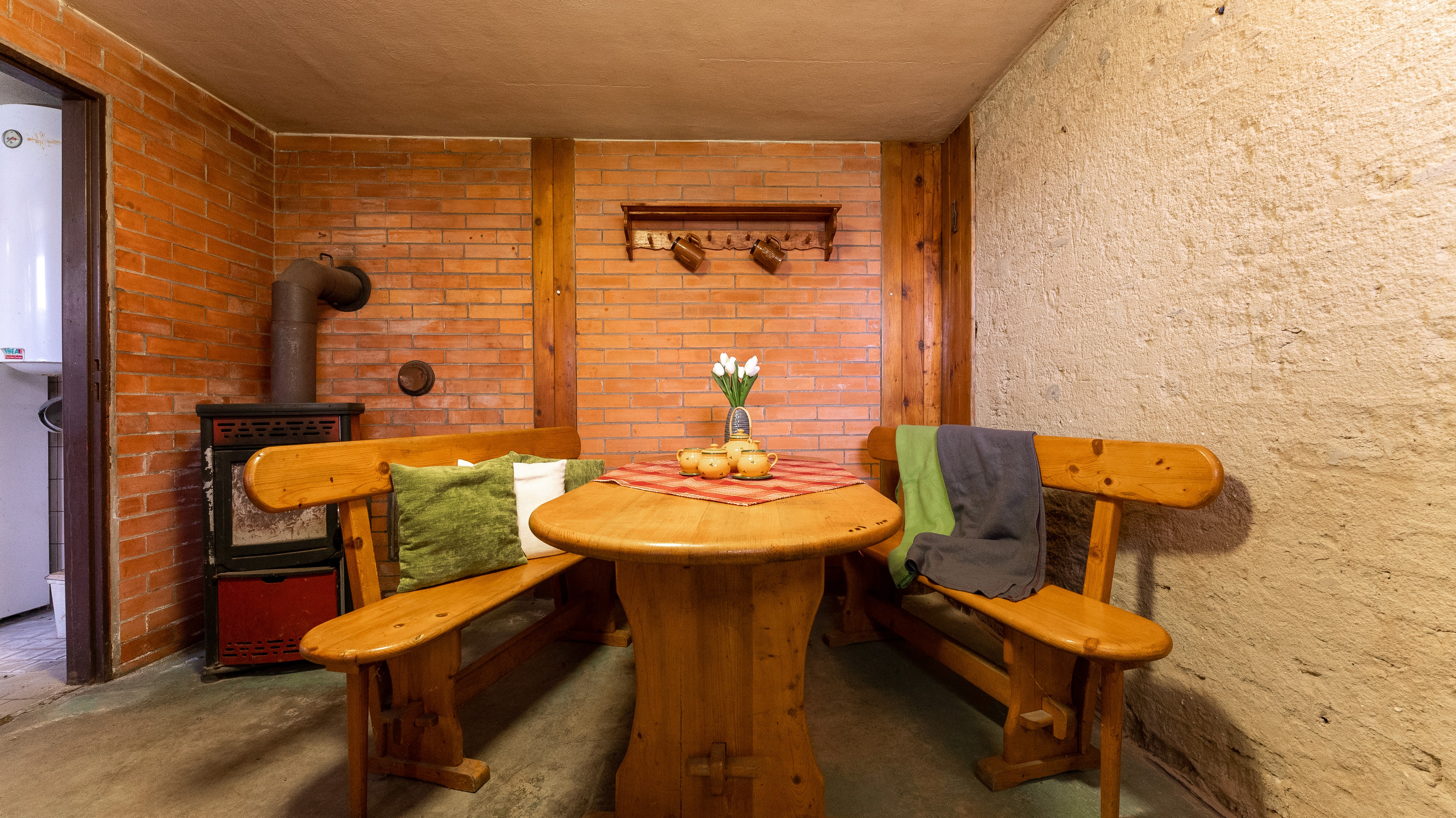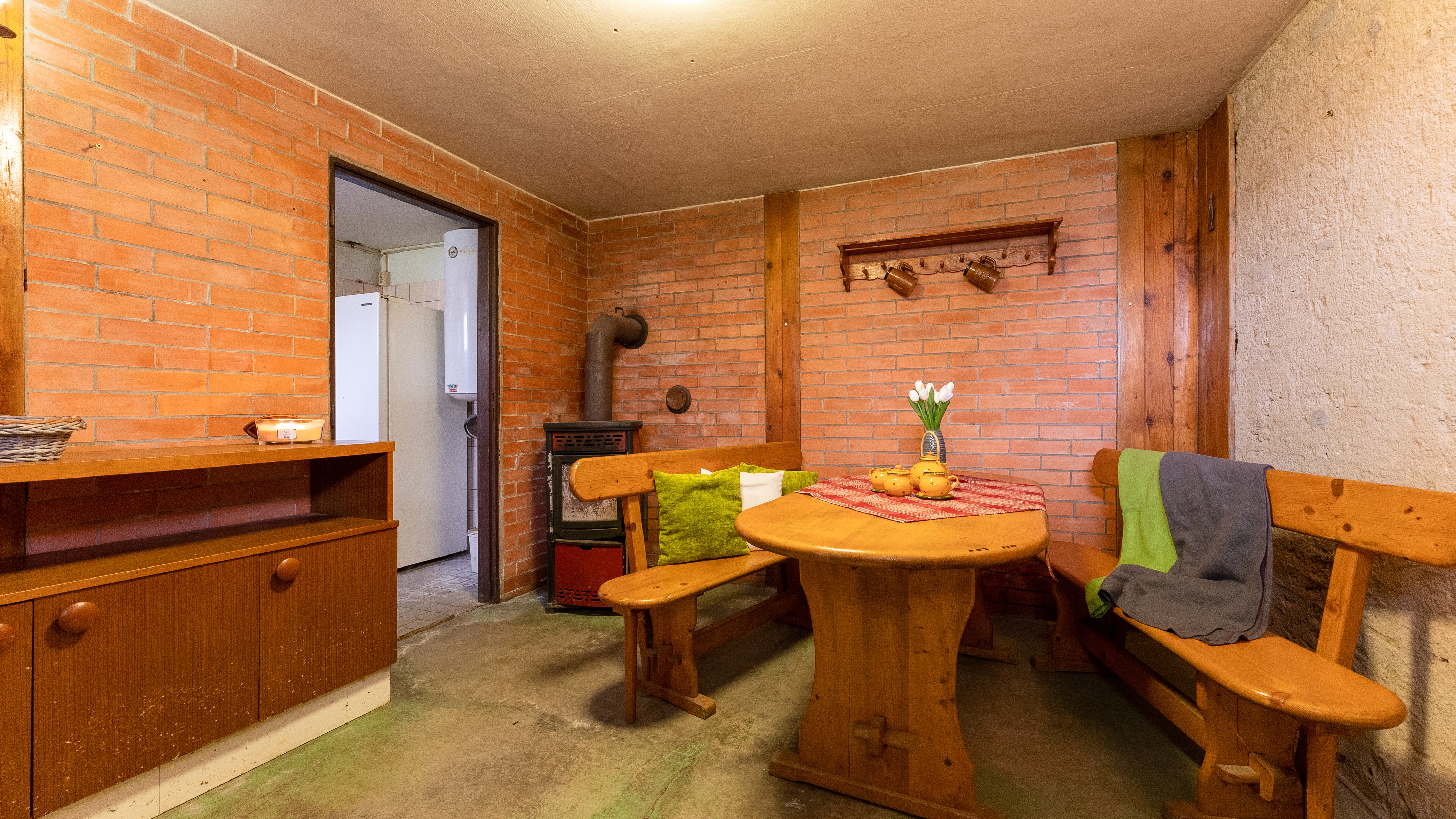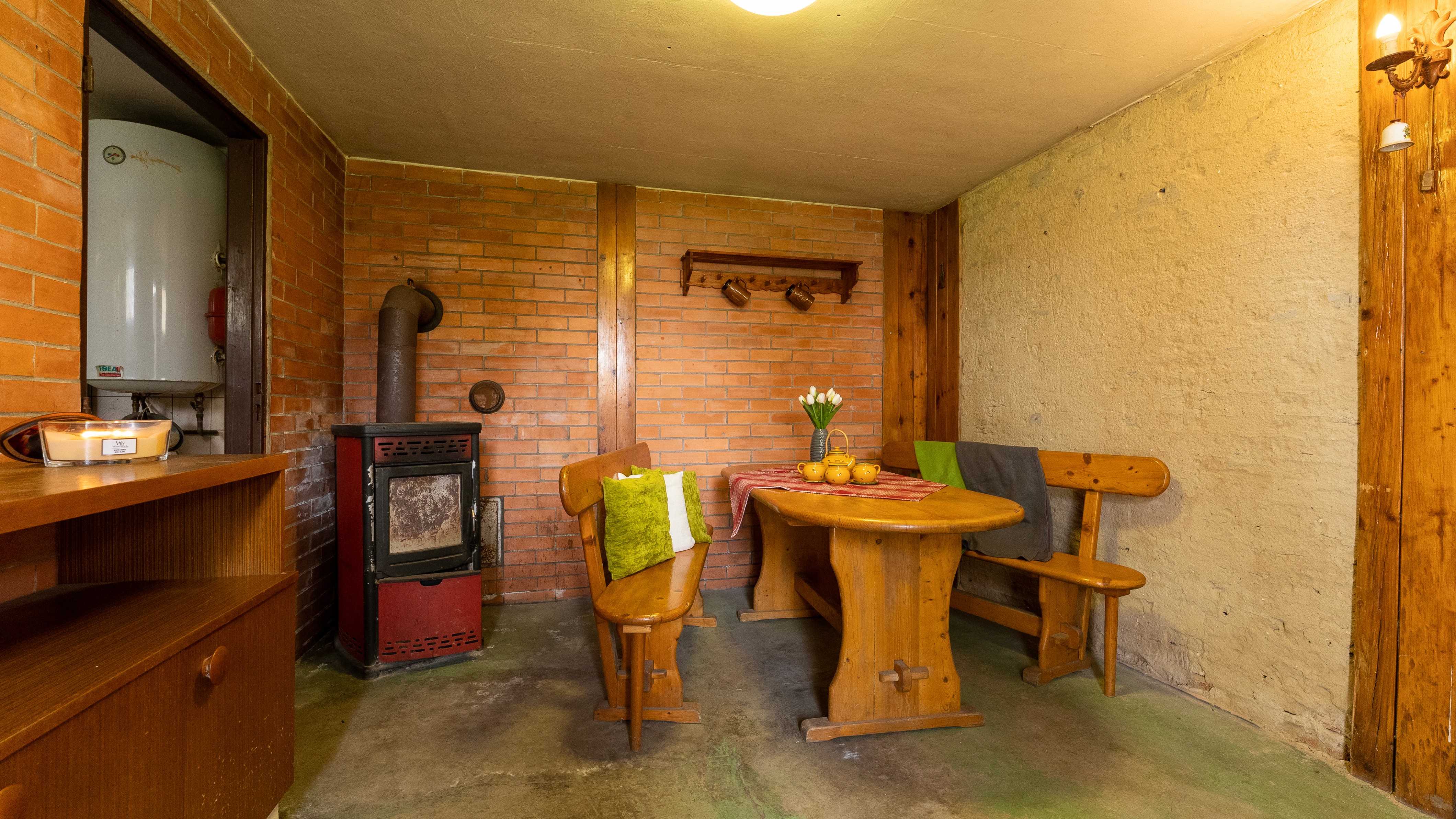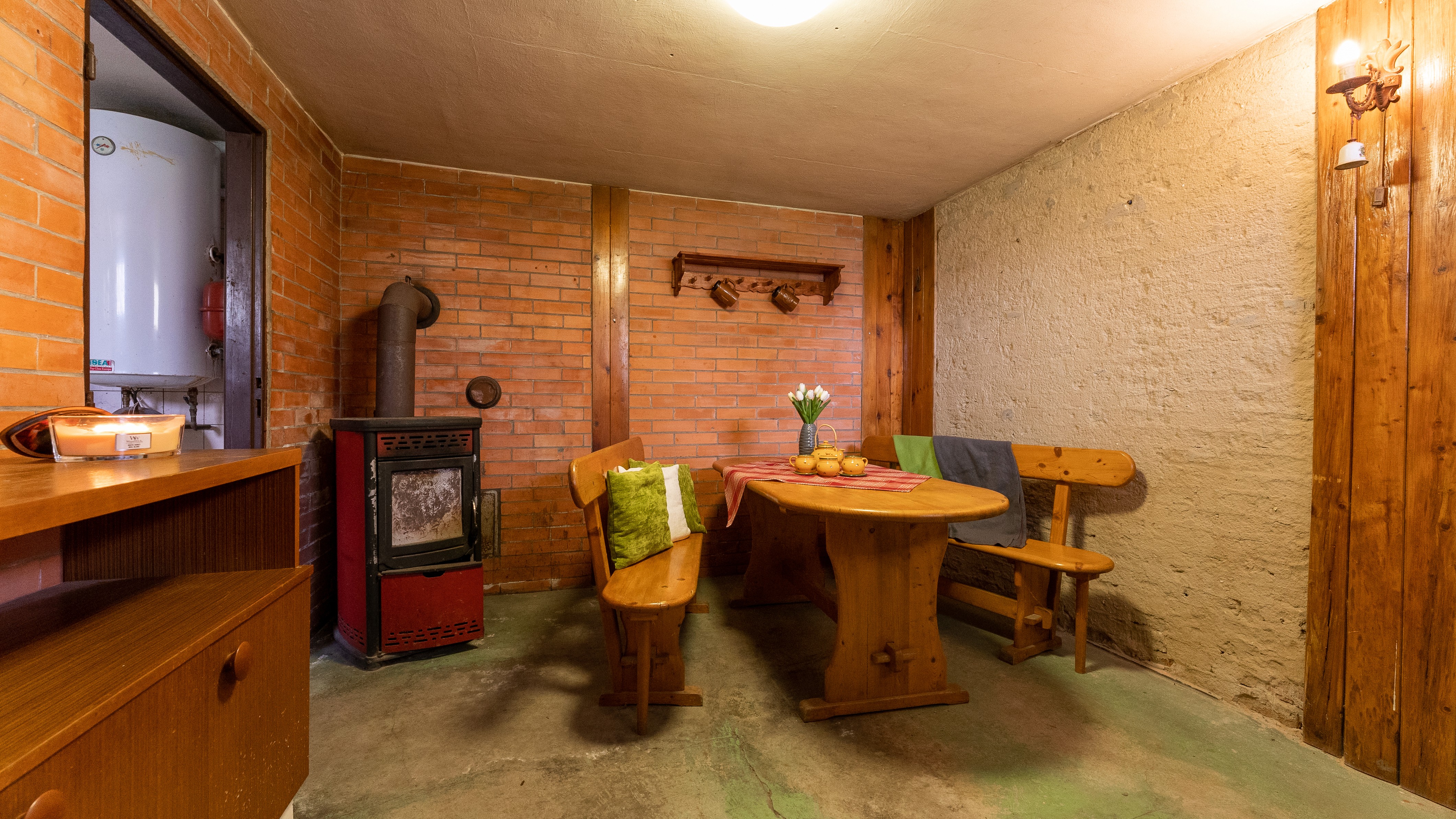 Vytápění: Kombinovaný kotel na dřevo a elektřinu (zajišťuje i ohřev vody).