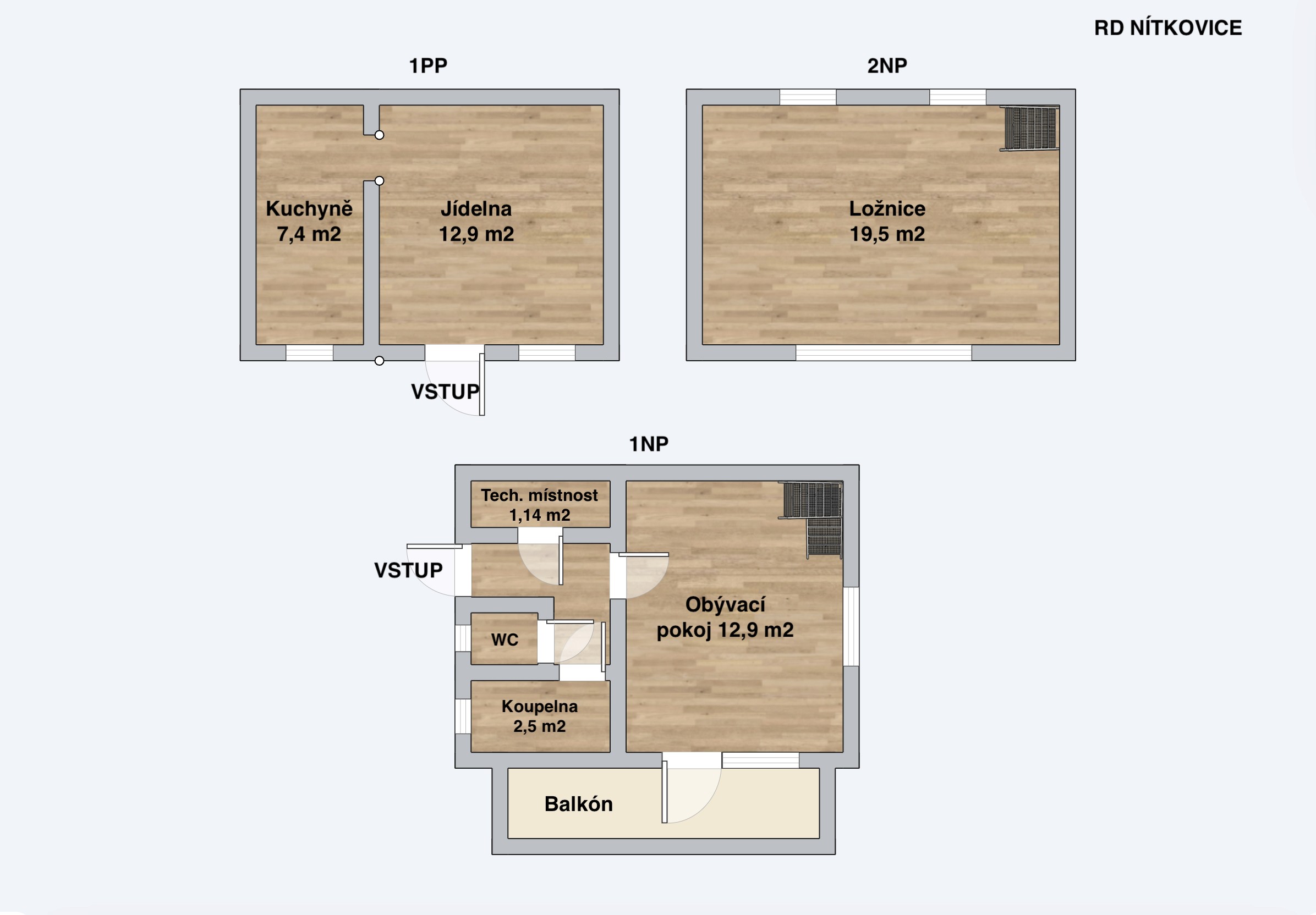 1. patro: Obývací pokoj, koupelna, WC a technická místnost.