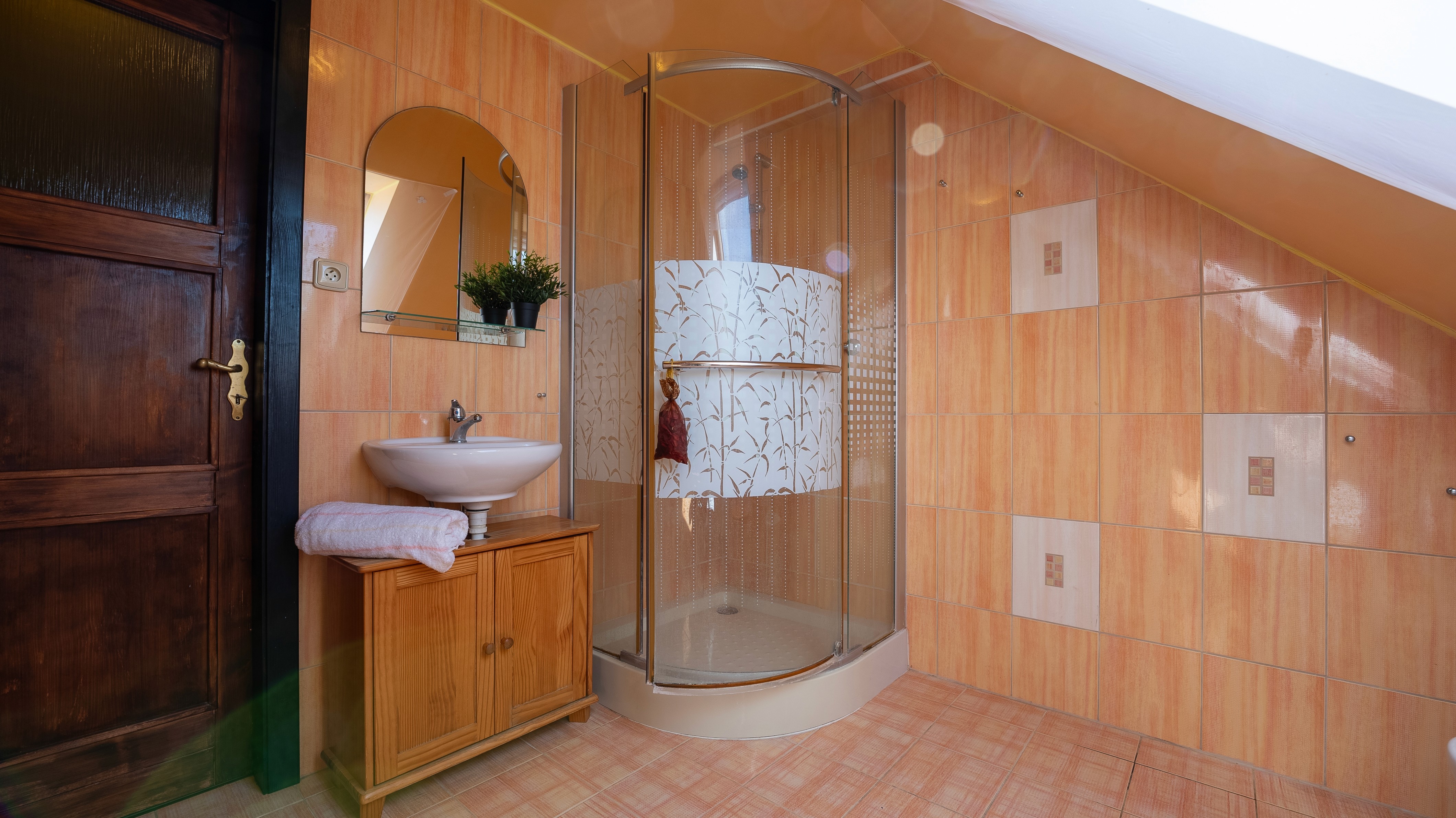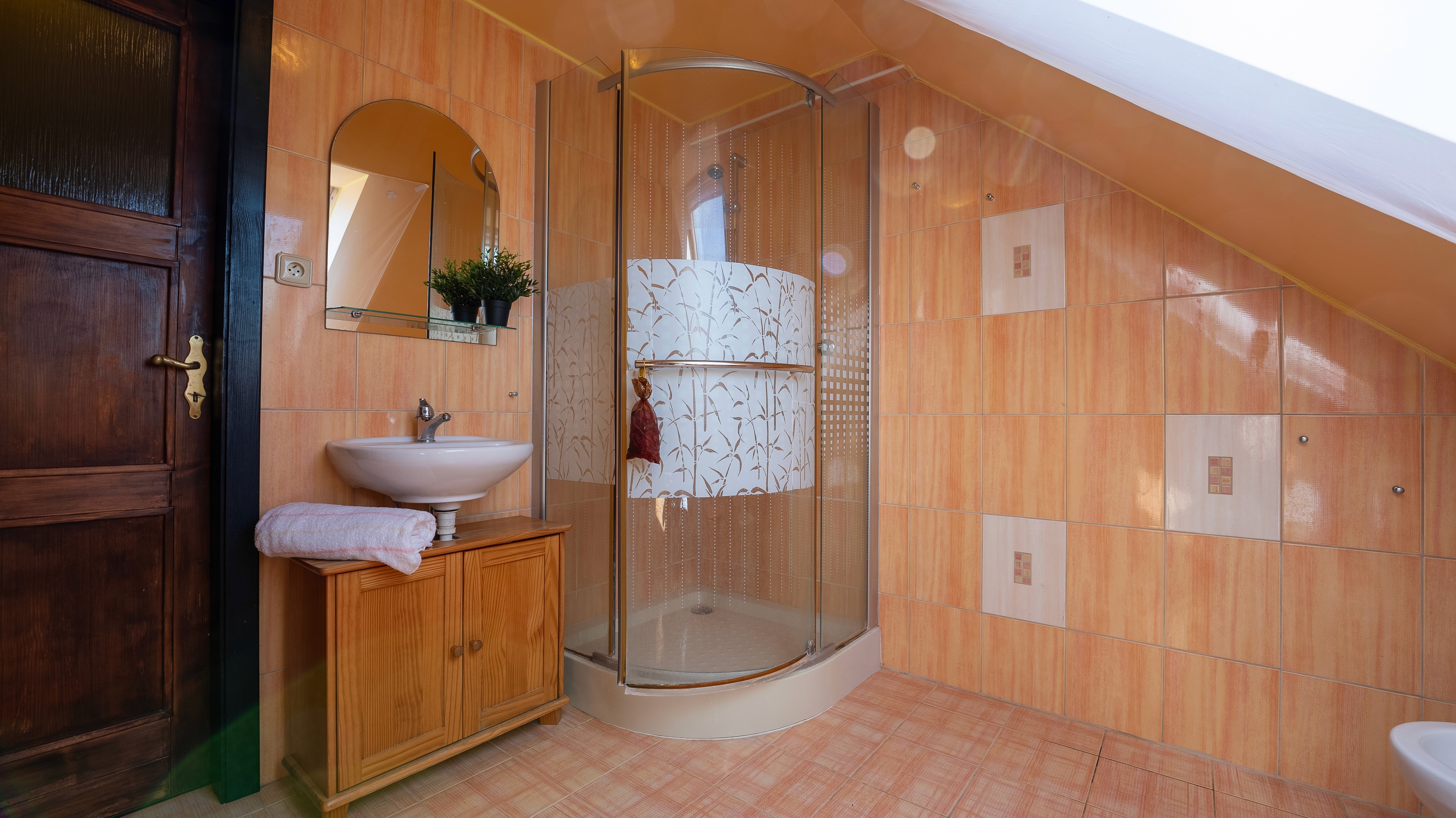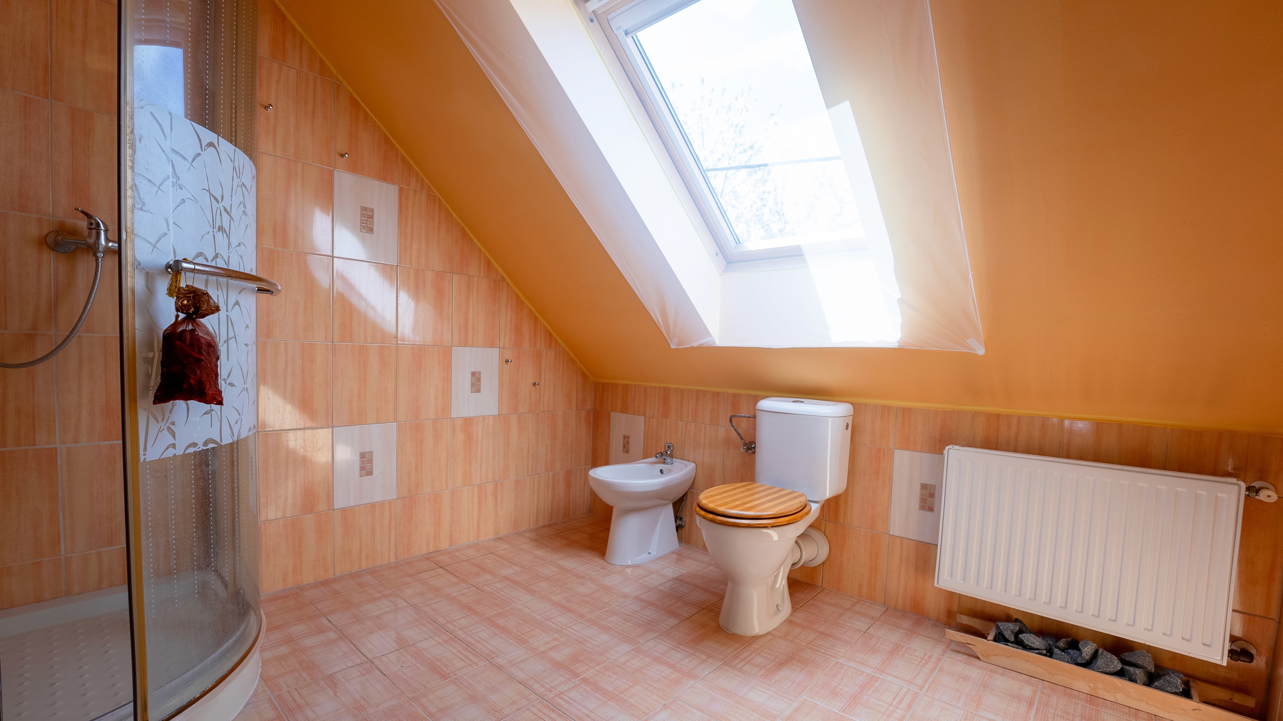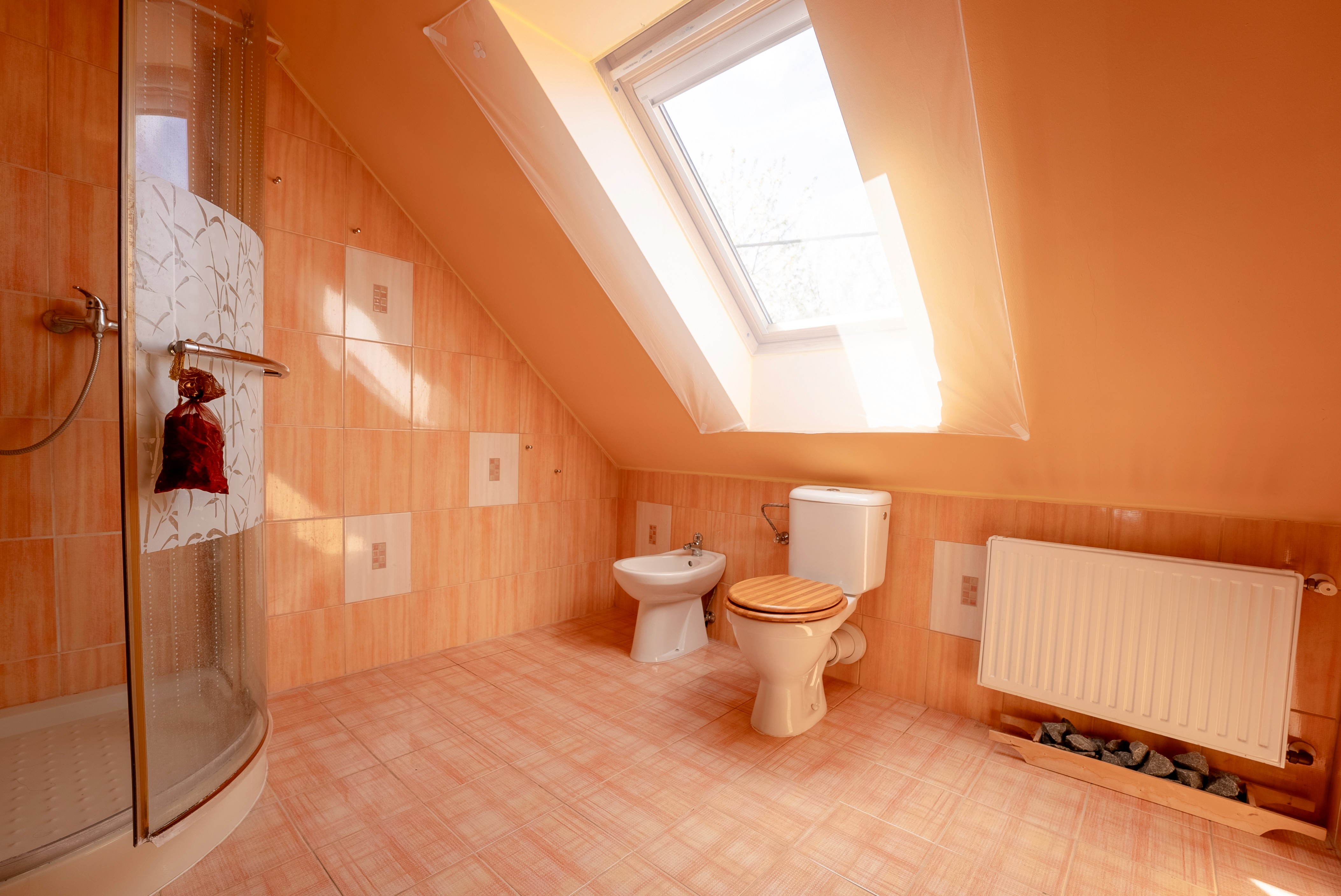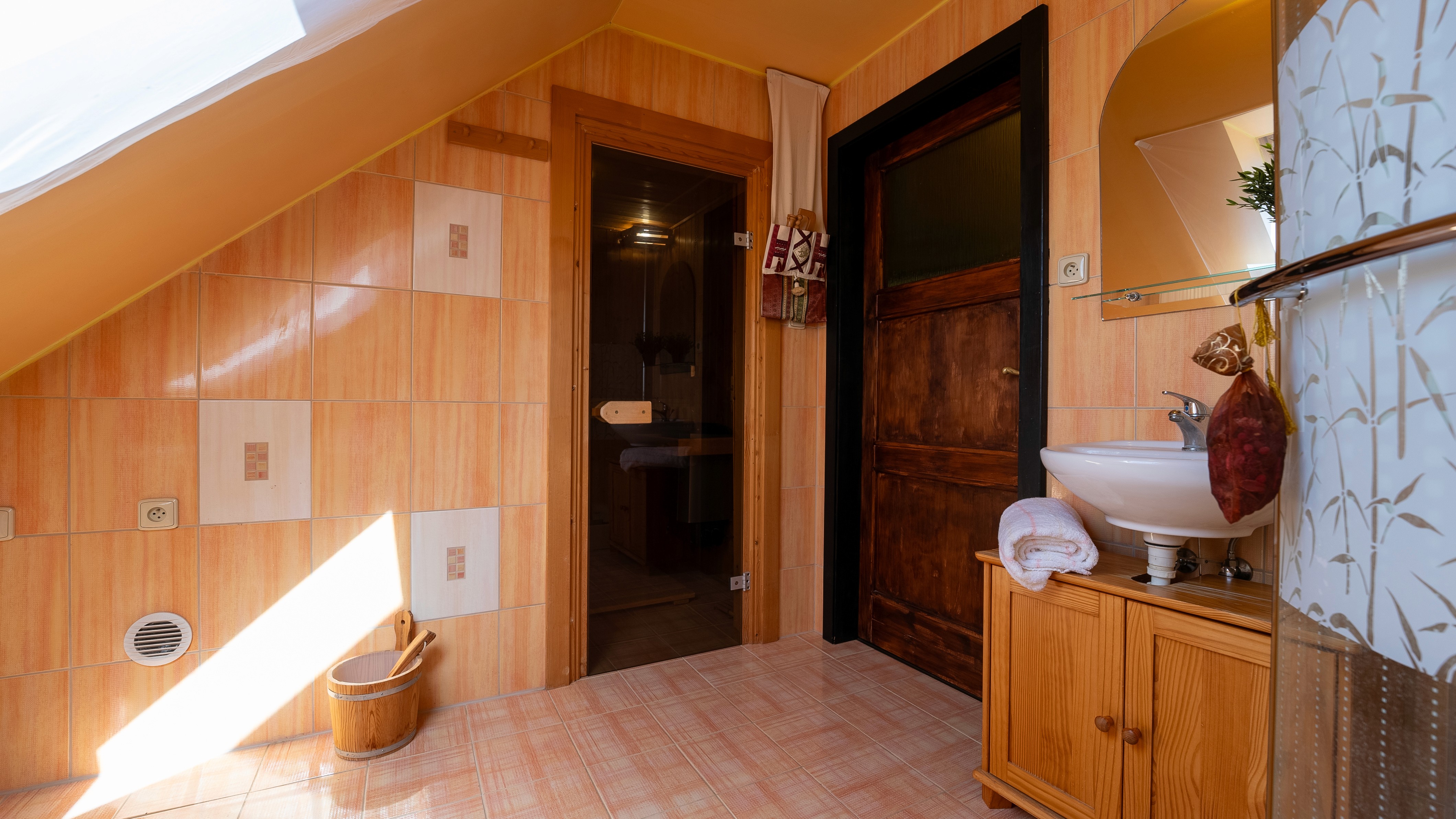 Nová koupelna se saunou v podkroví.