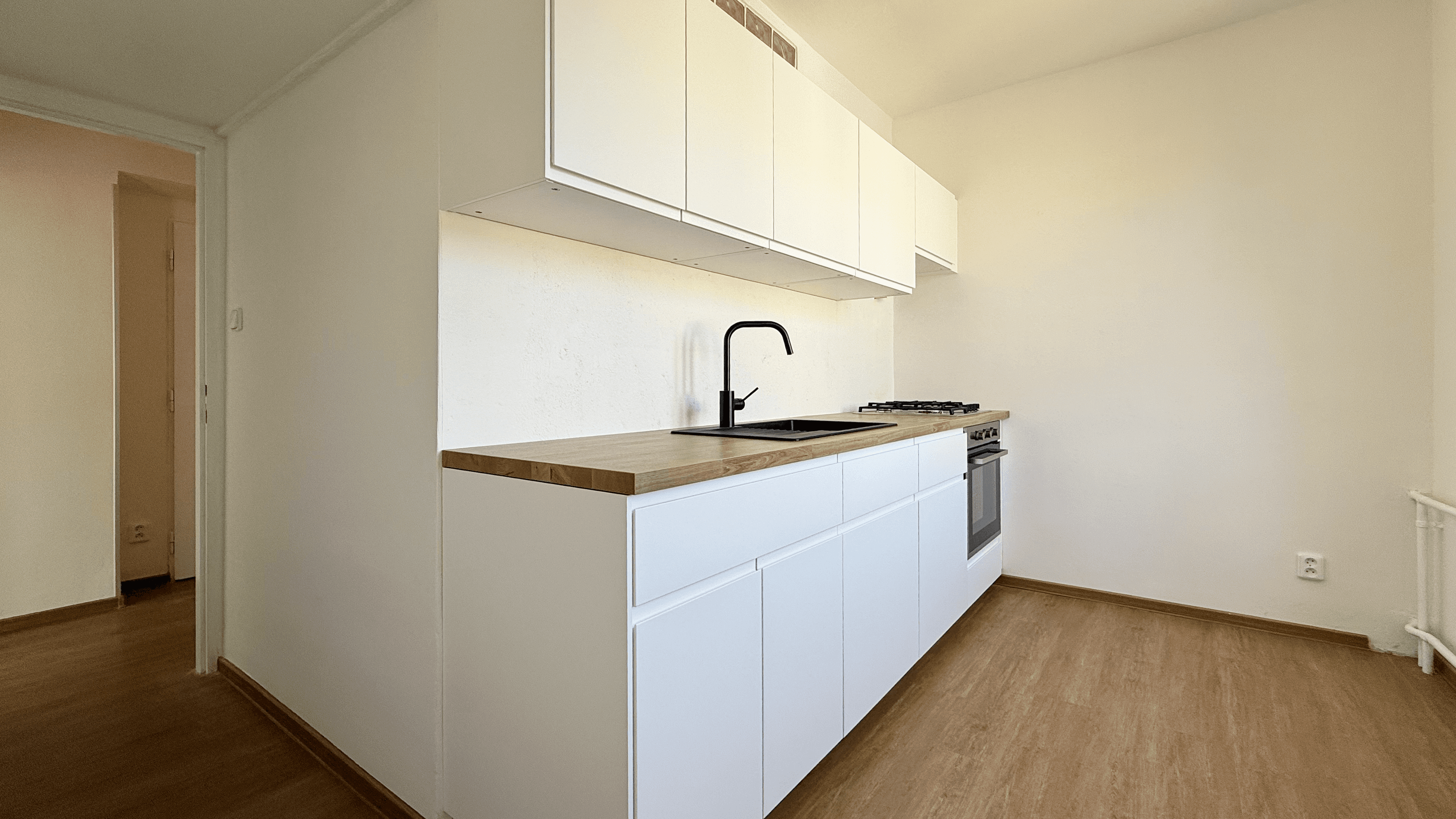 Poznámka: Kuchyňská linka a osvětlení budou dokončeny tak, aby byl byt při předání plně funkční.