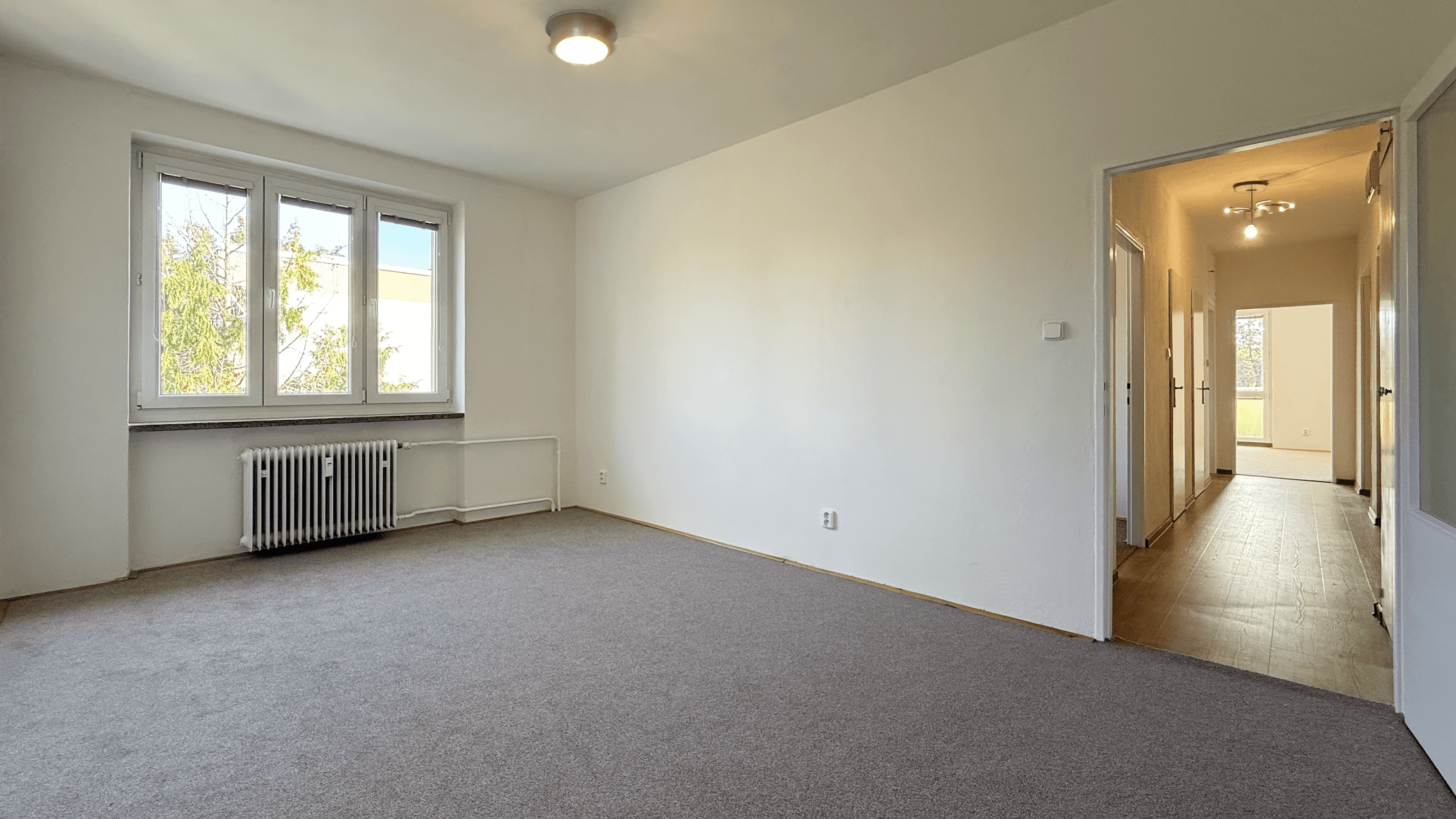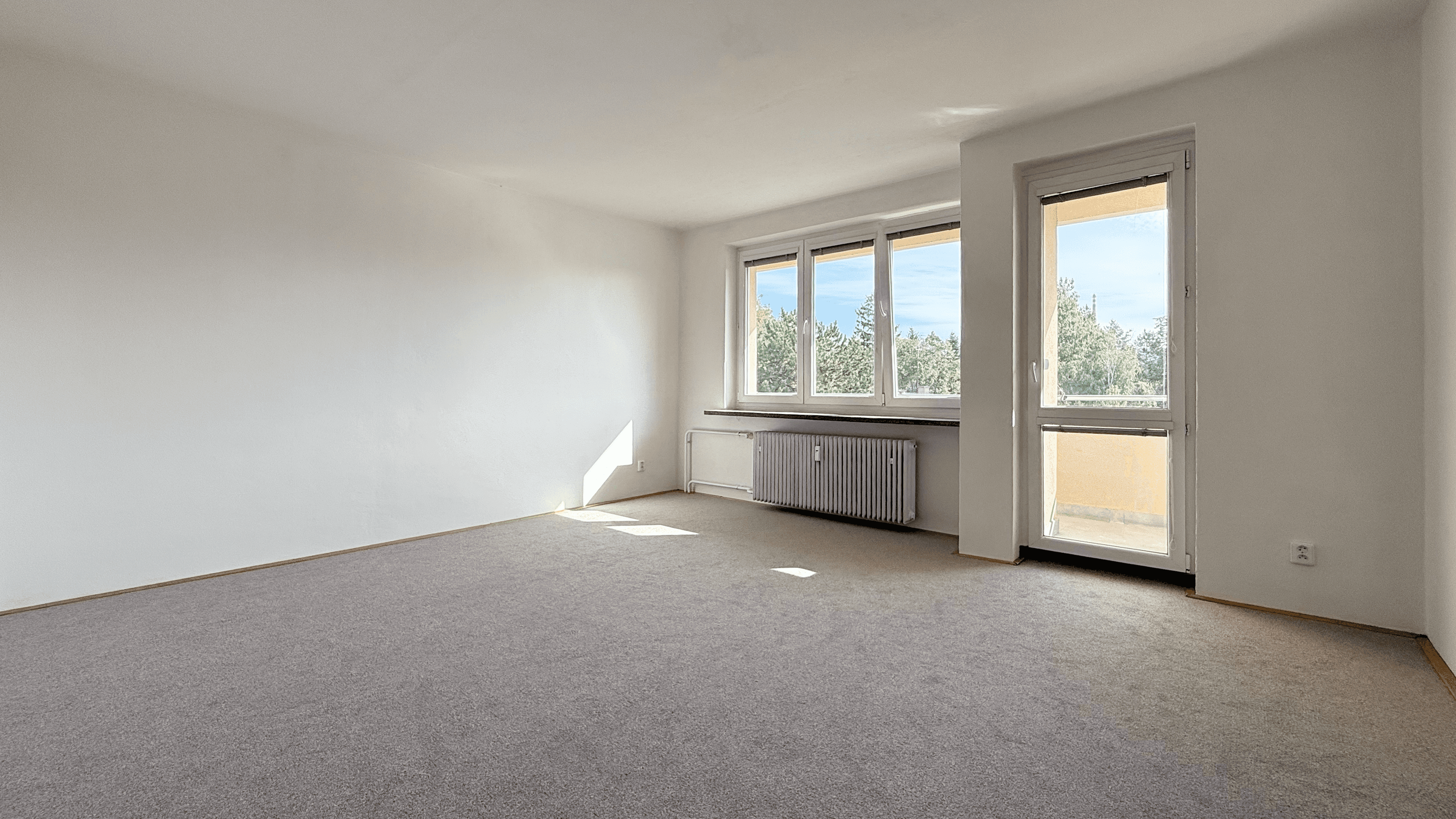 Prostorný obývací pokoj se vstupem na balkon (5 m²).