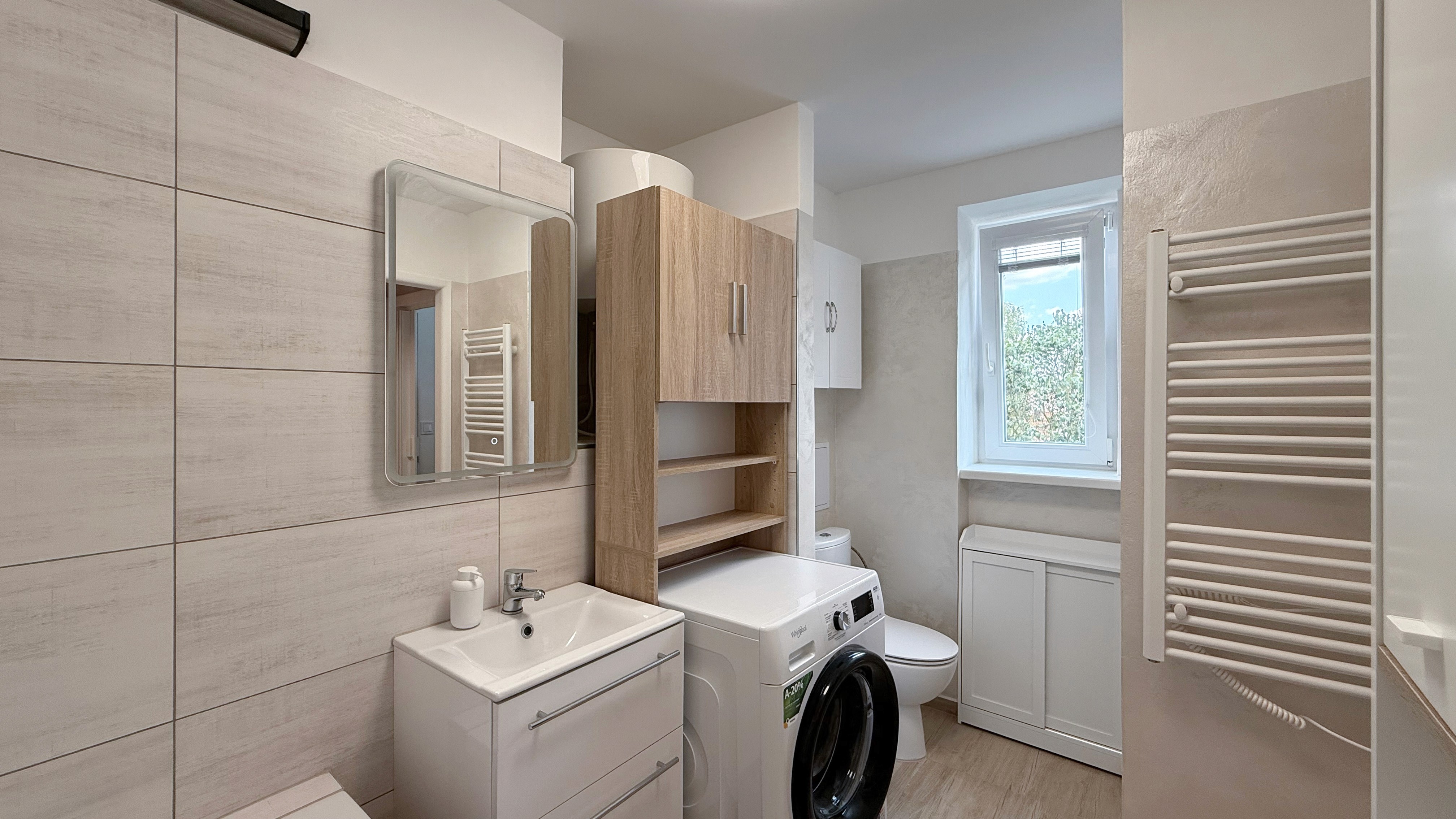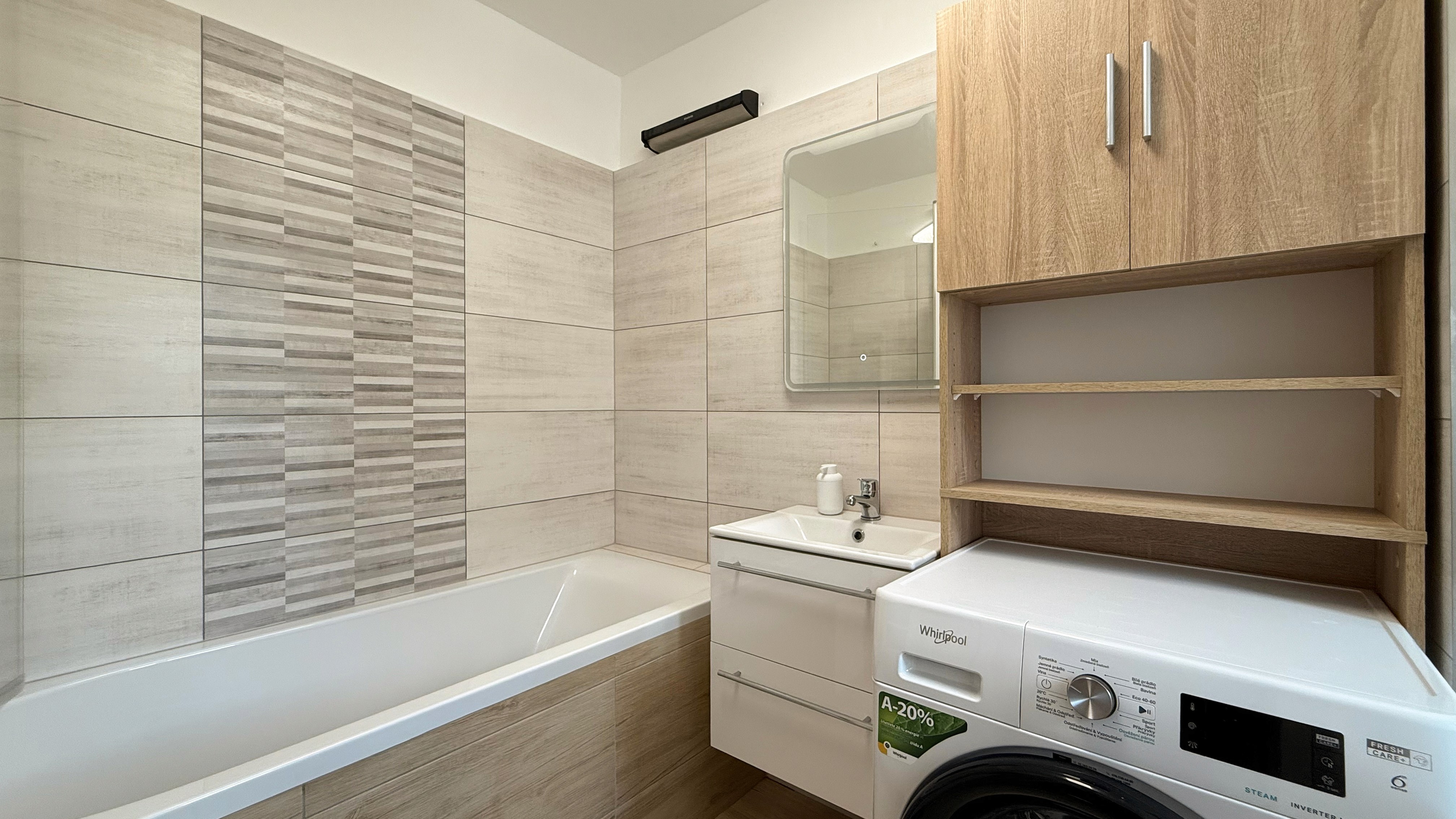 Koupelna: Sprchový kout, umyvadlo se skříňkou, WC, pračka.