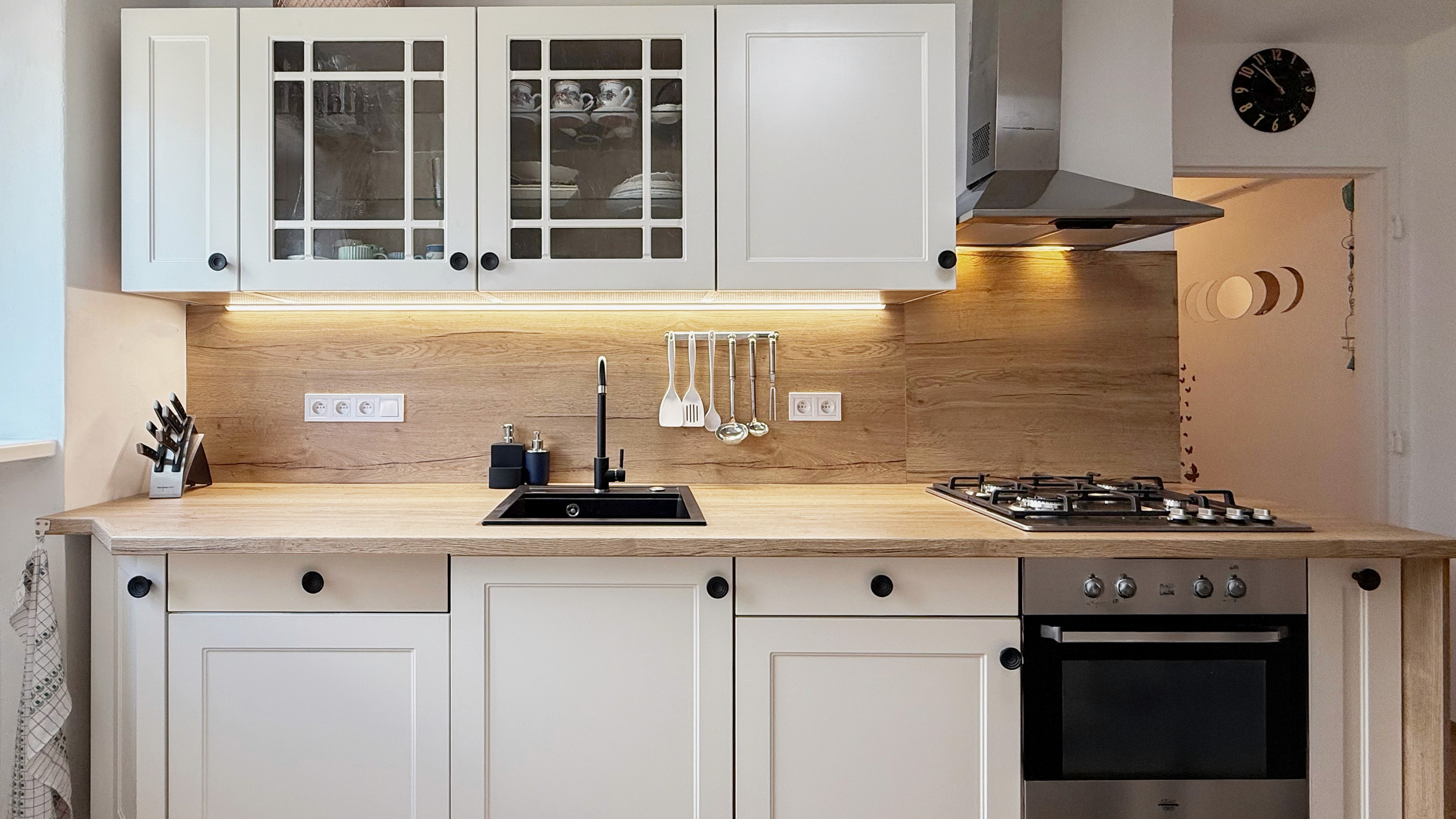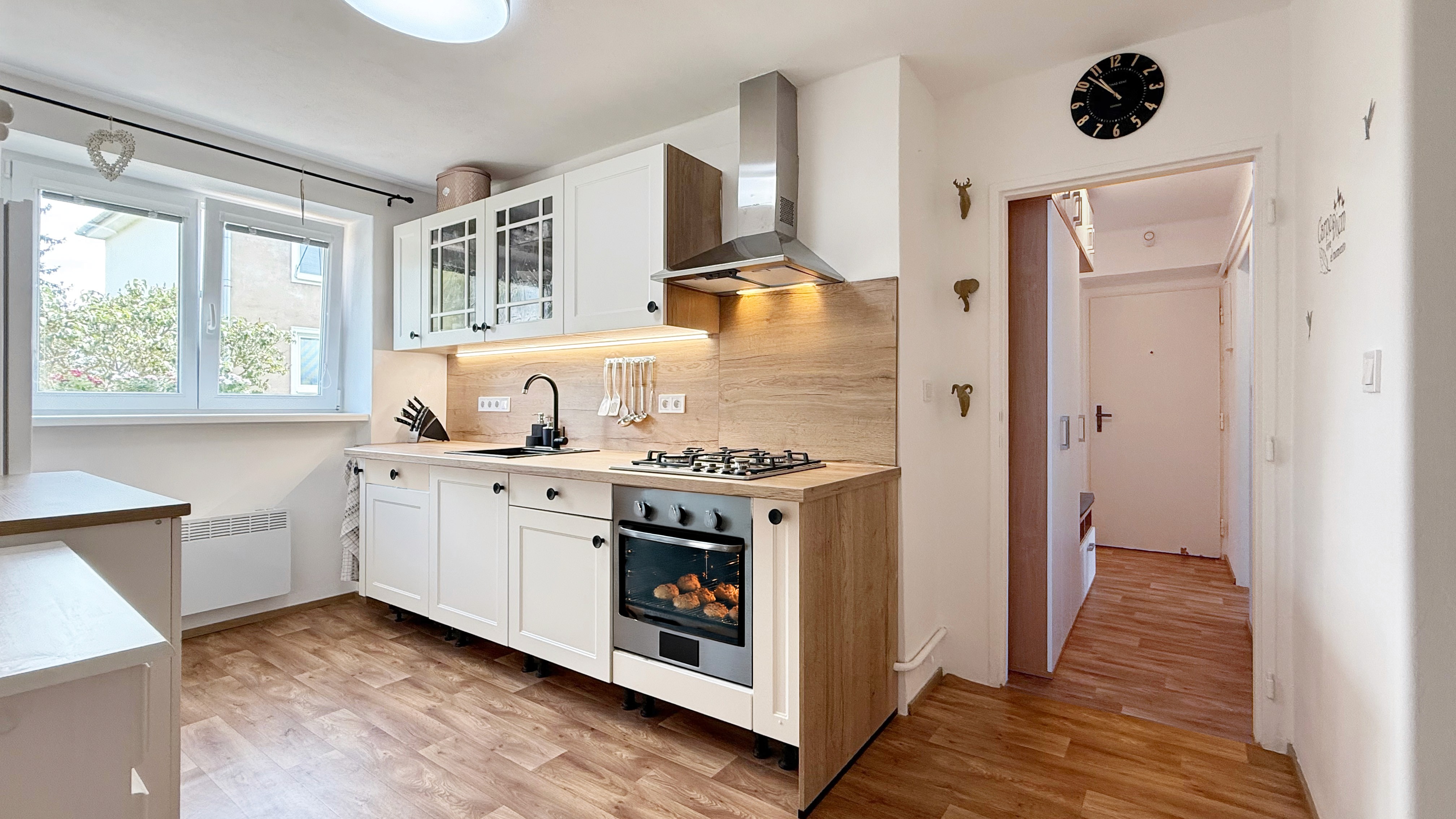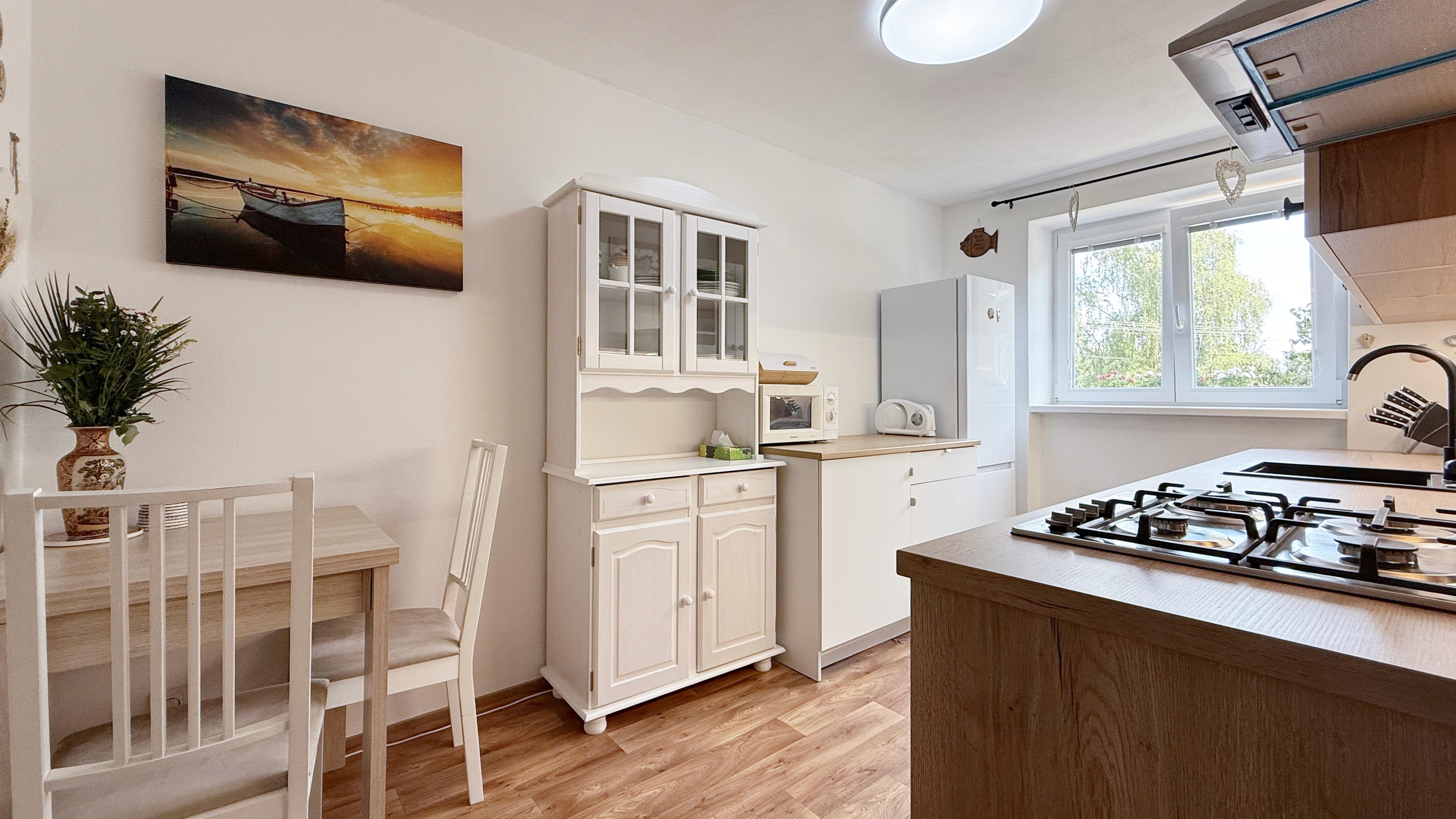 Kuchyně: Plynový sporák, trouba, mikrovlnka, myčka, lednice.