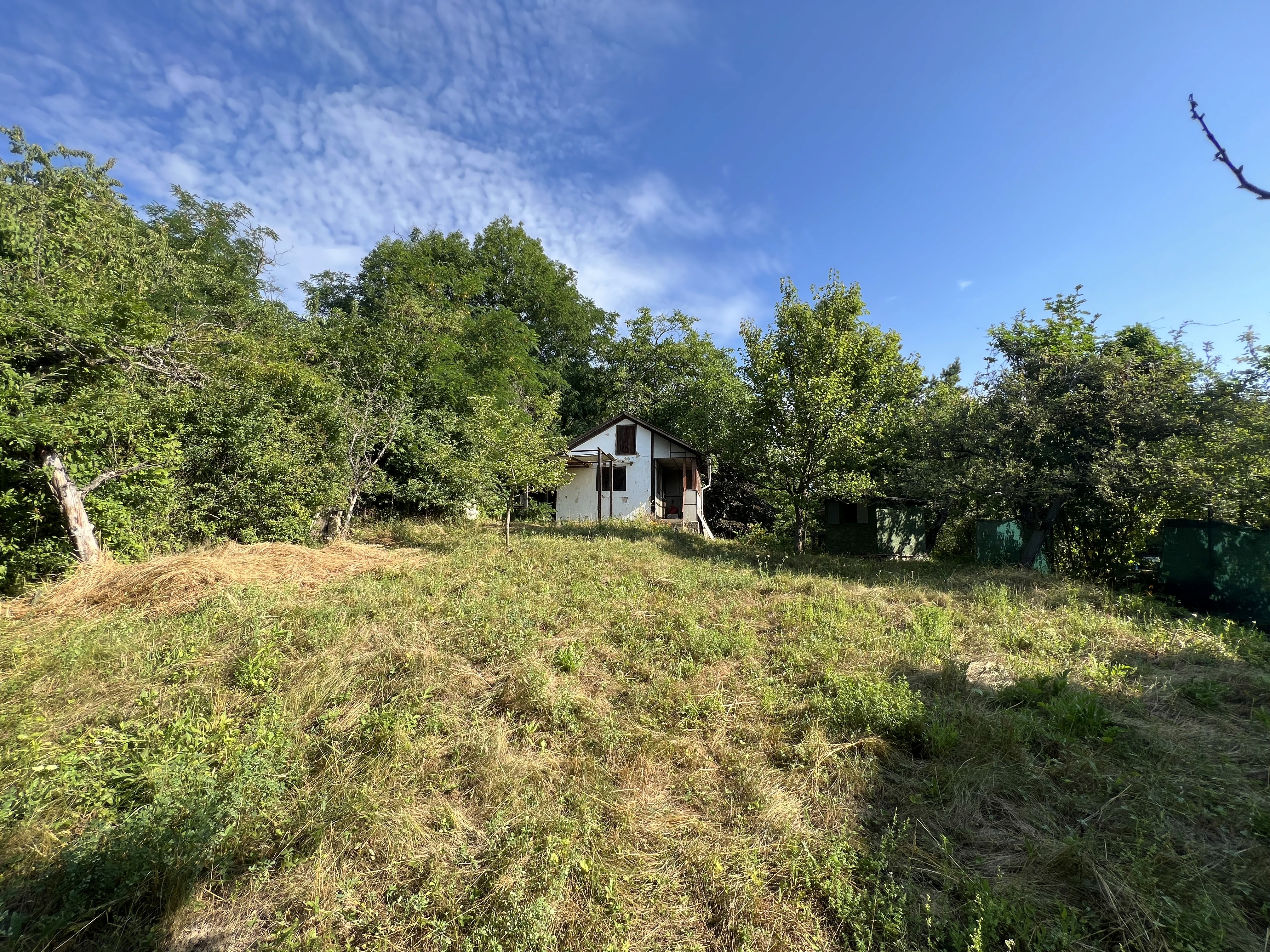 Na pozemku se nachází zděná chata o ploše 23 m², která může sloužit jako úložný prostor pro zahradní náčiní nebo jako místo pro odpočinek.