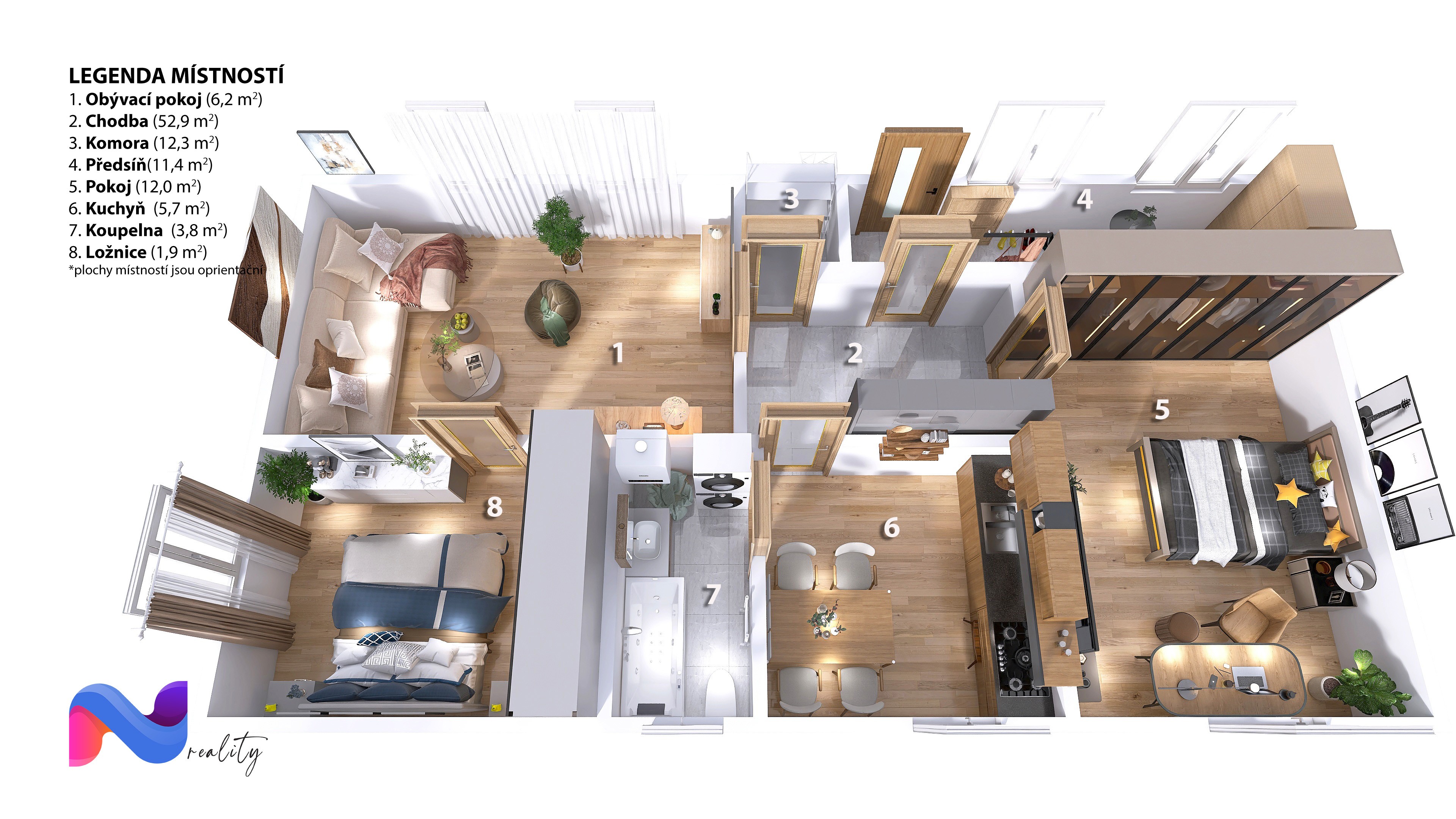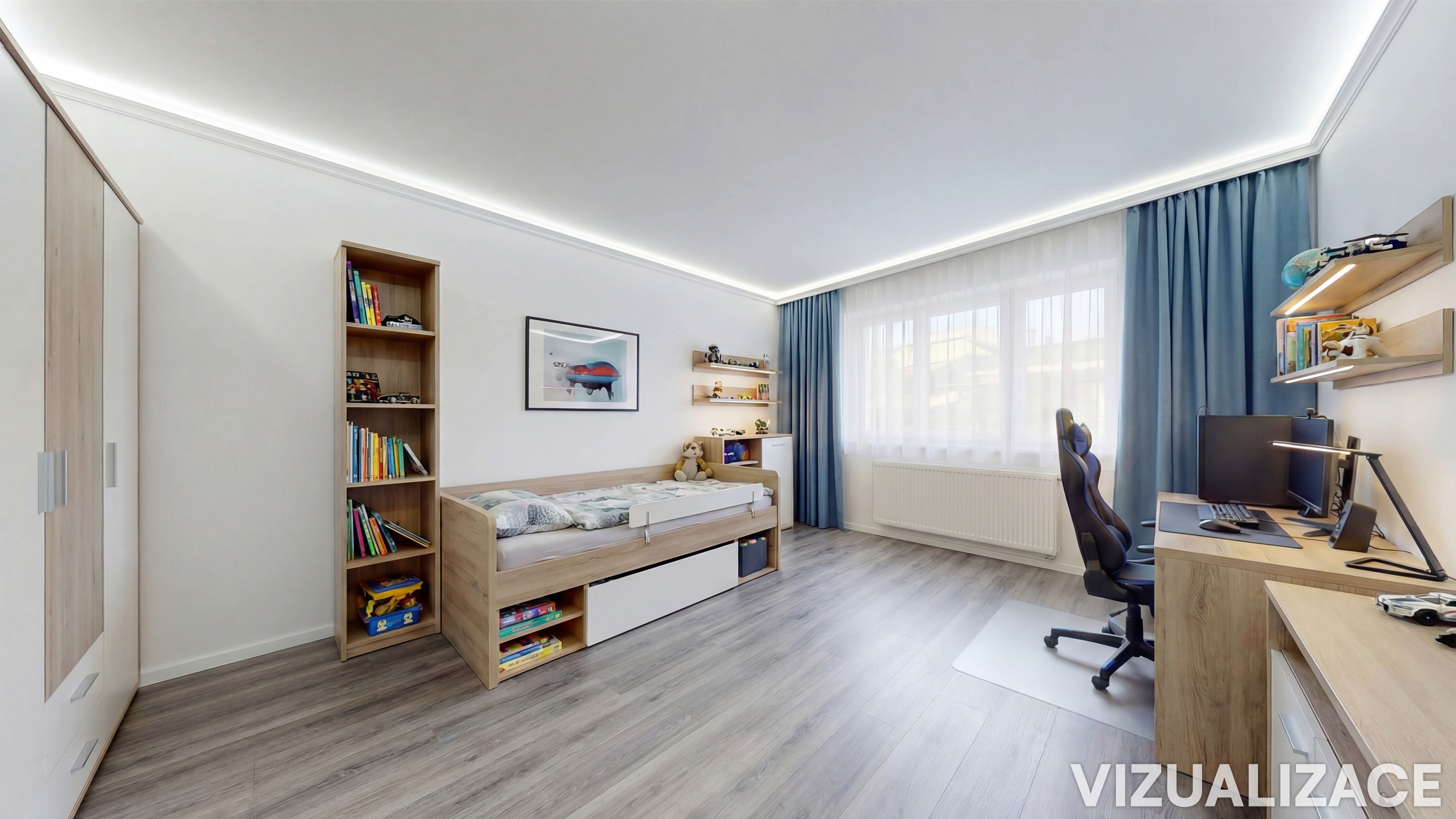 Dvě samostatné místnosti (ložnice a dětský pokoj/pracovna).