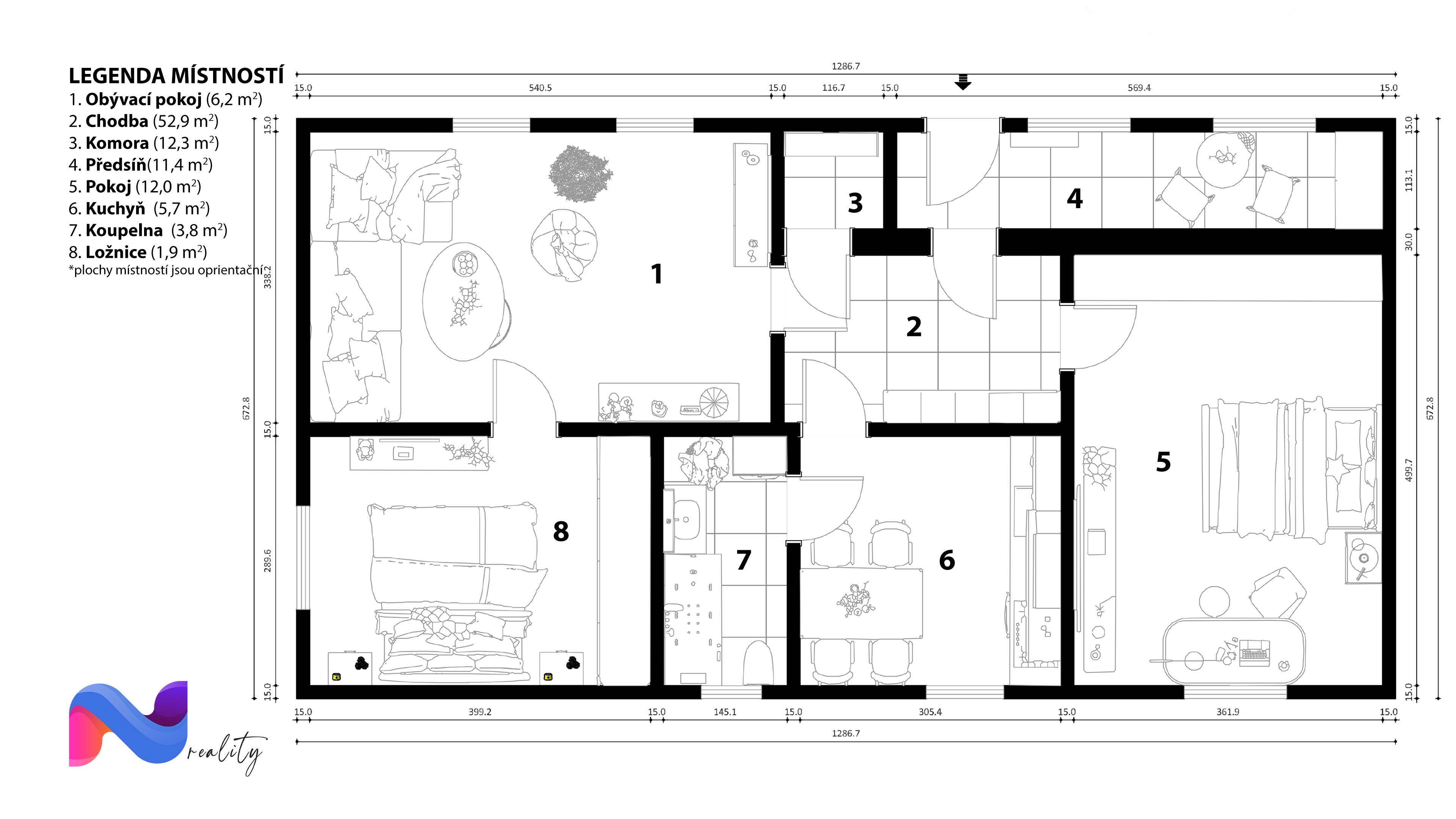 Prostorný obývací pokoj.