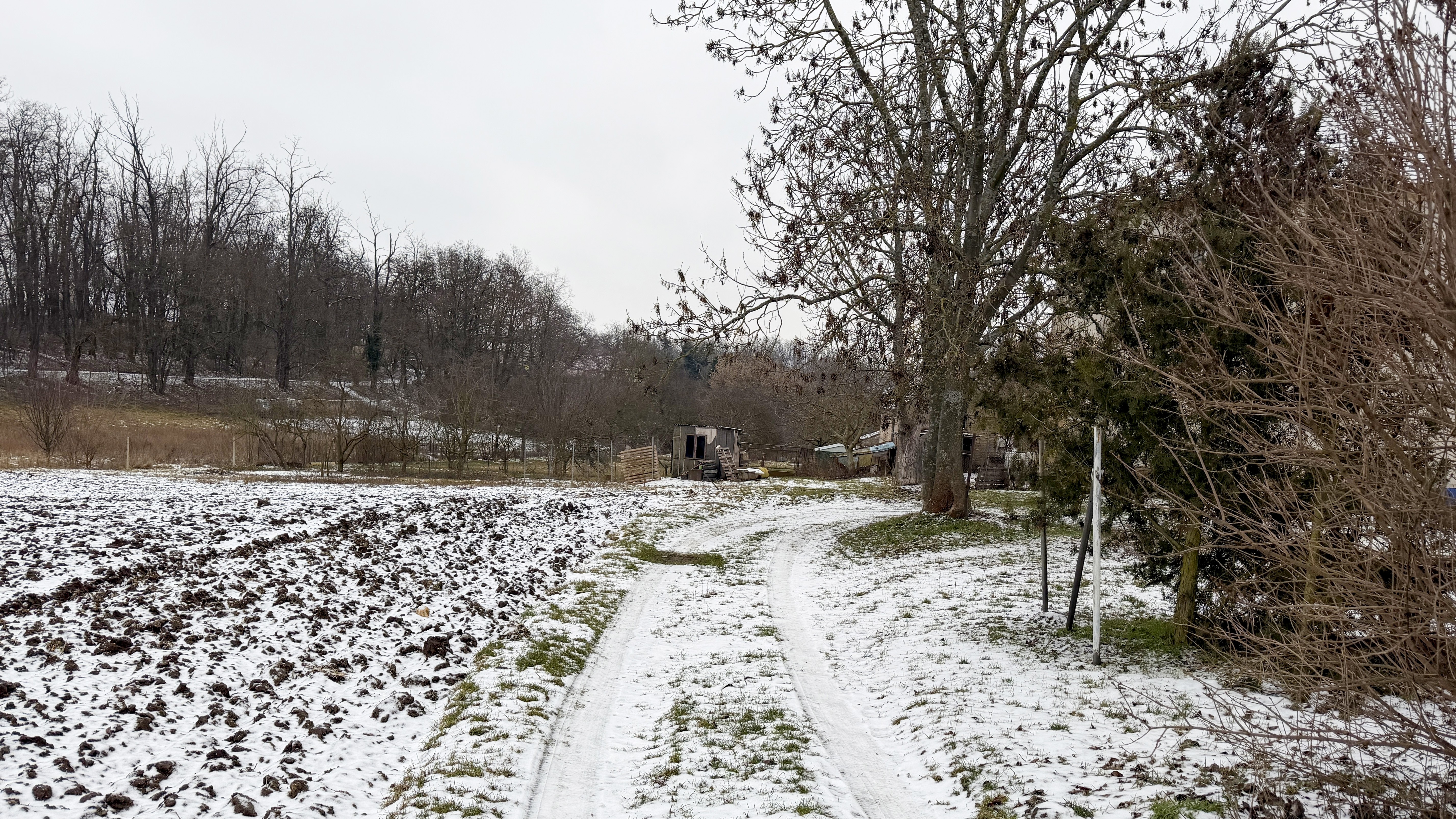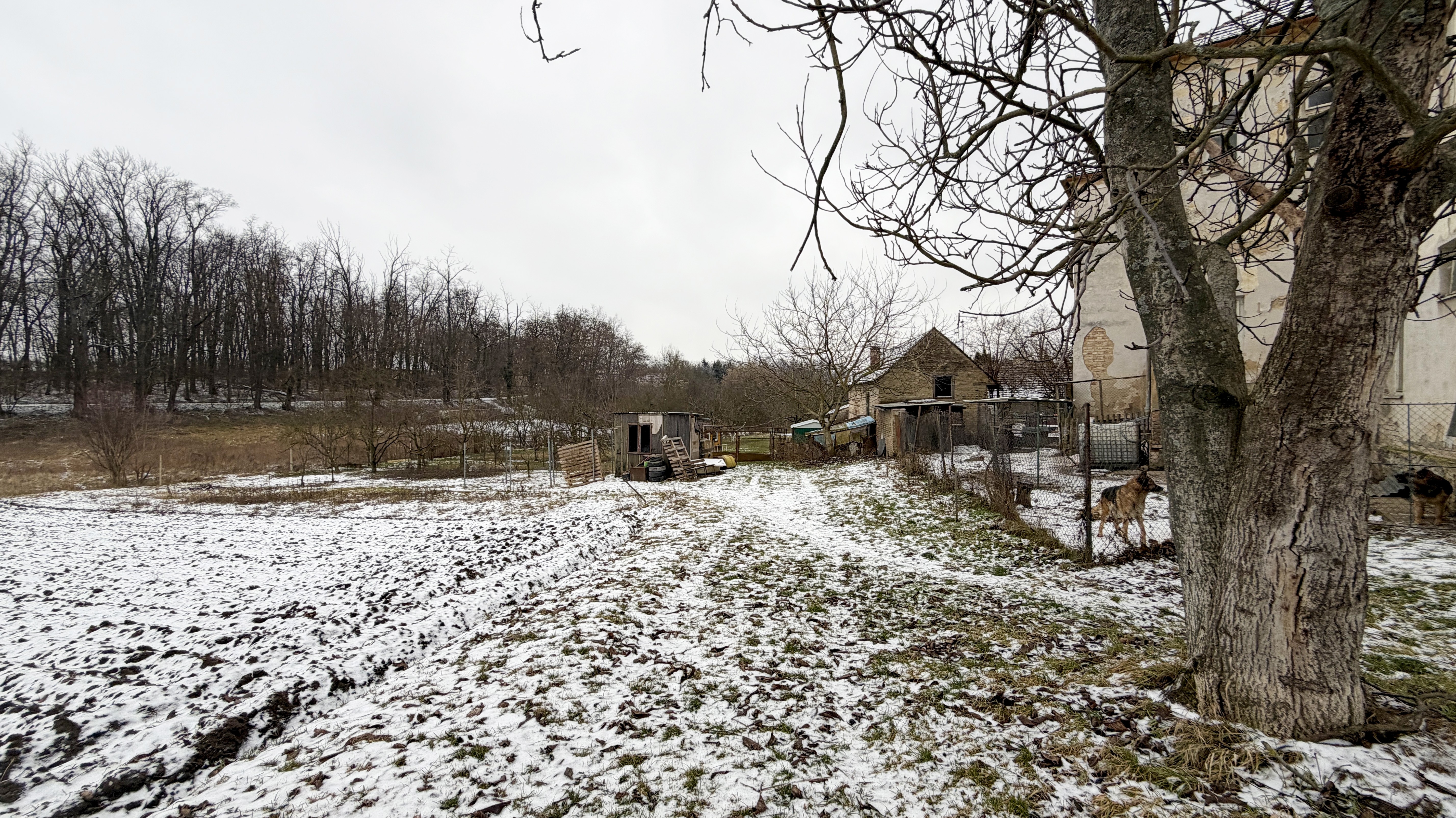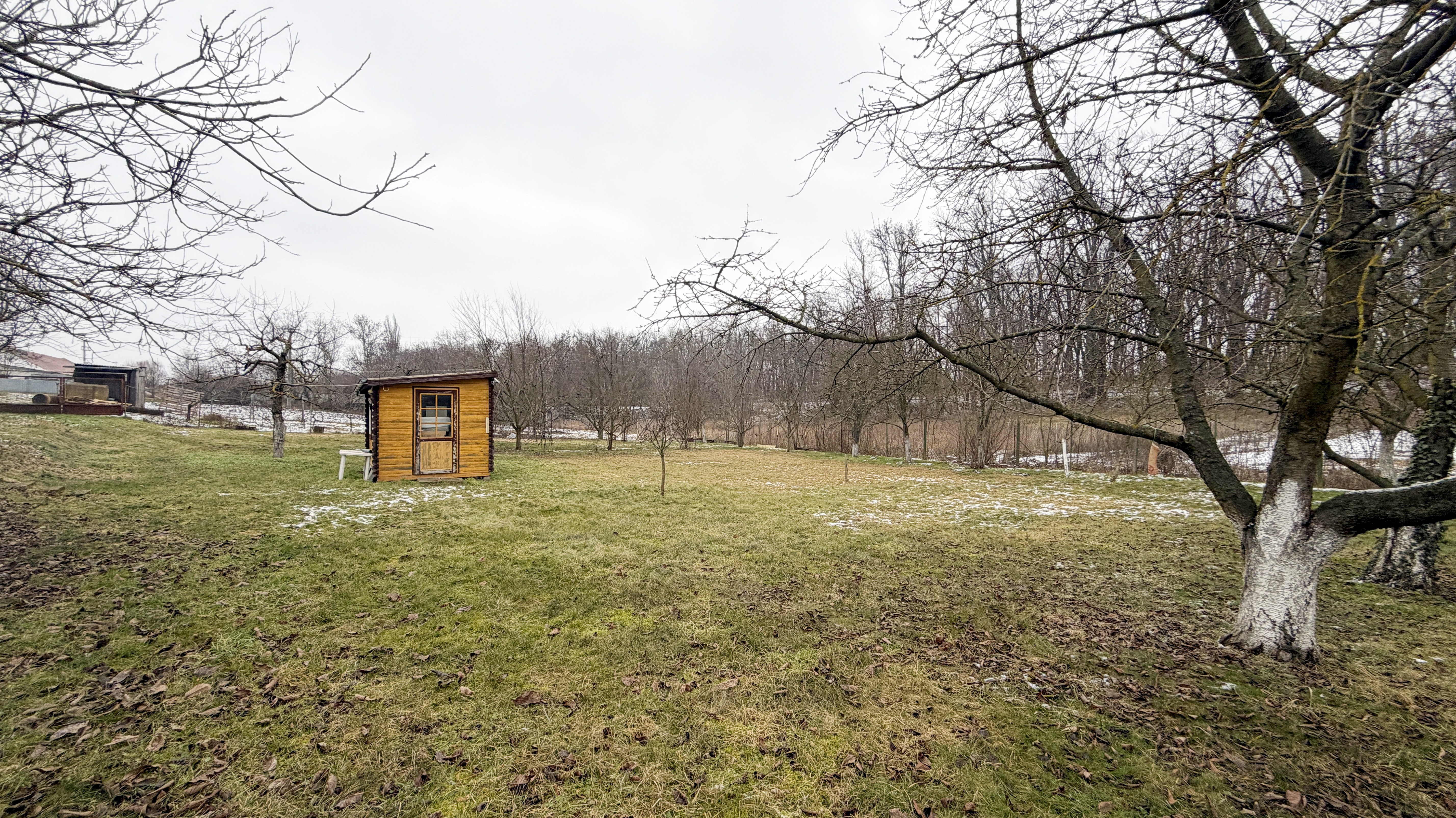 Vzrostlá zeleň: Pozemek je v současnosti veden jako ovocný sad, což novému majiteli zajišťuje příjemné přírodní prostředí ihned po koupi.
